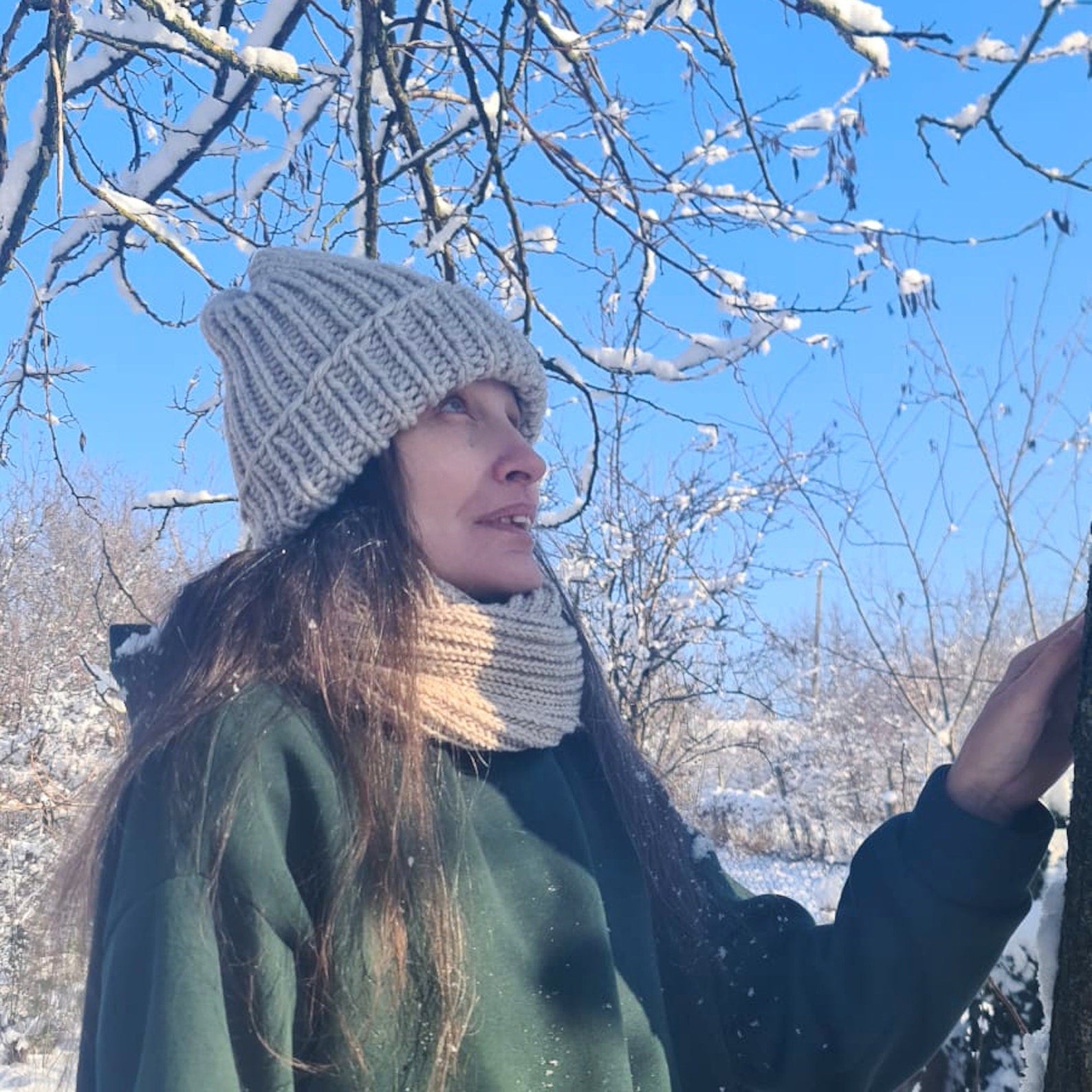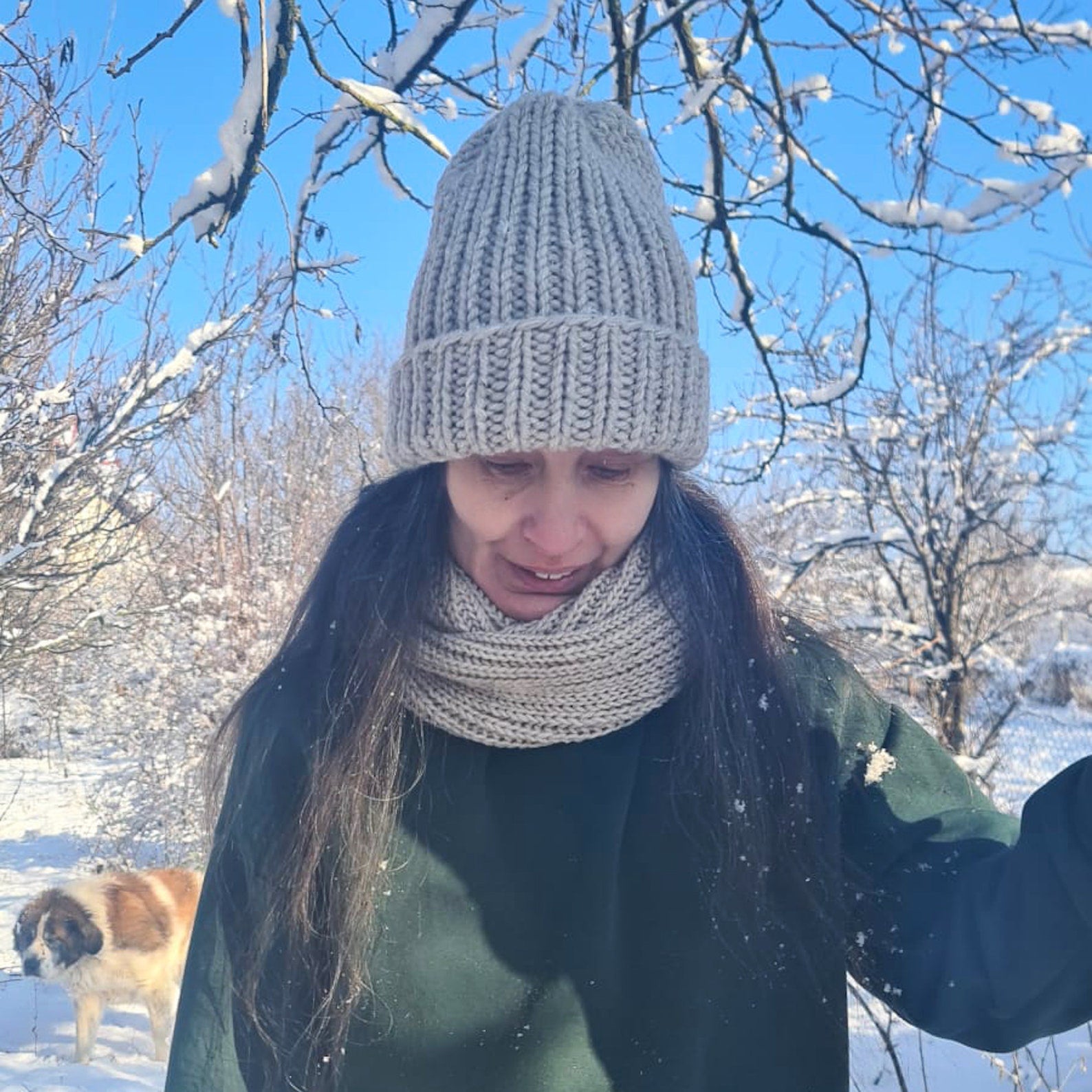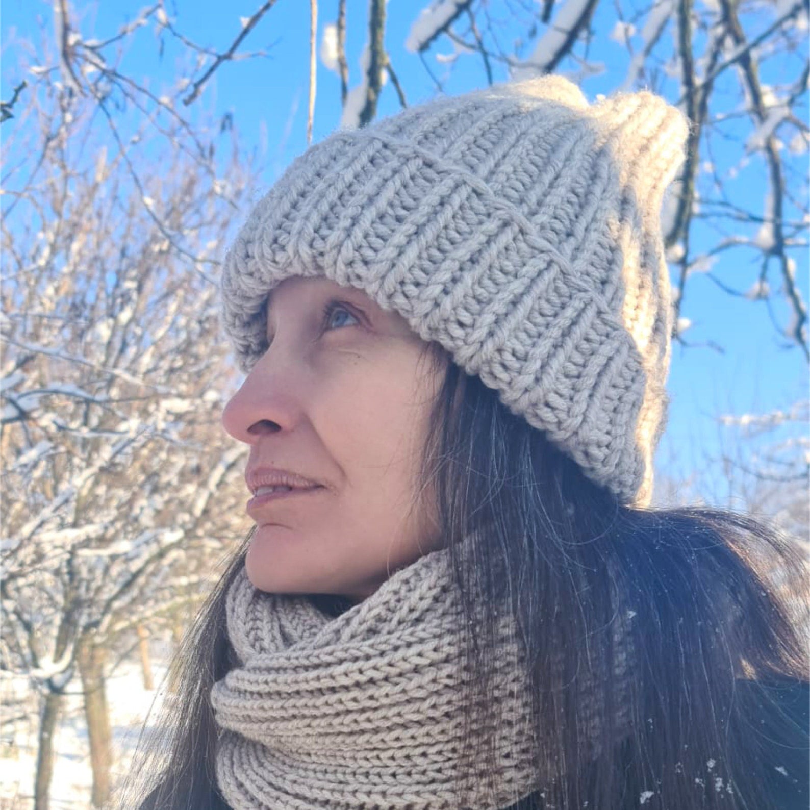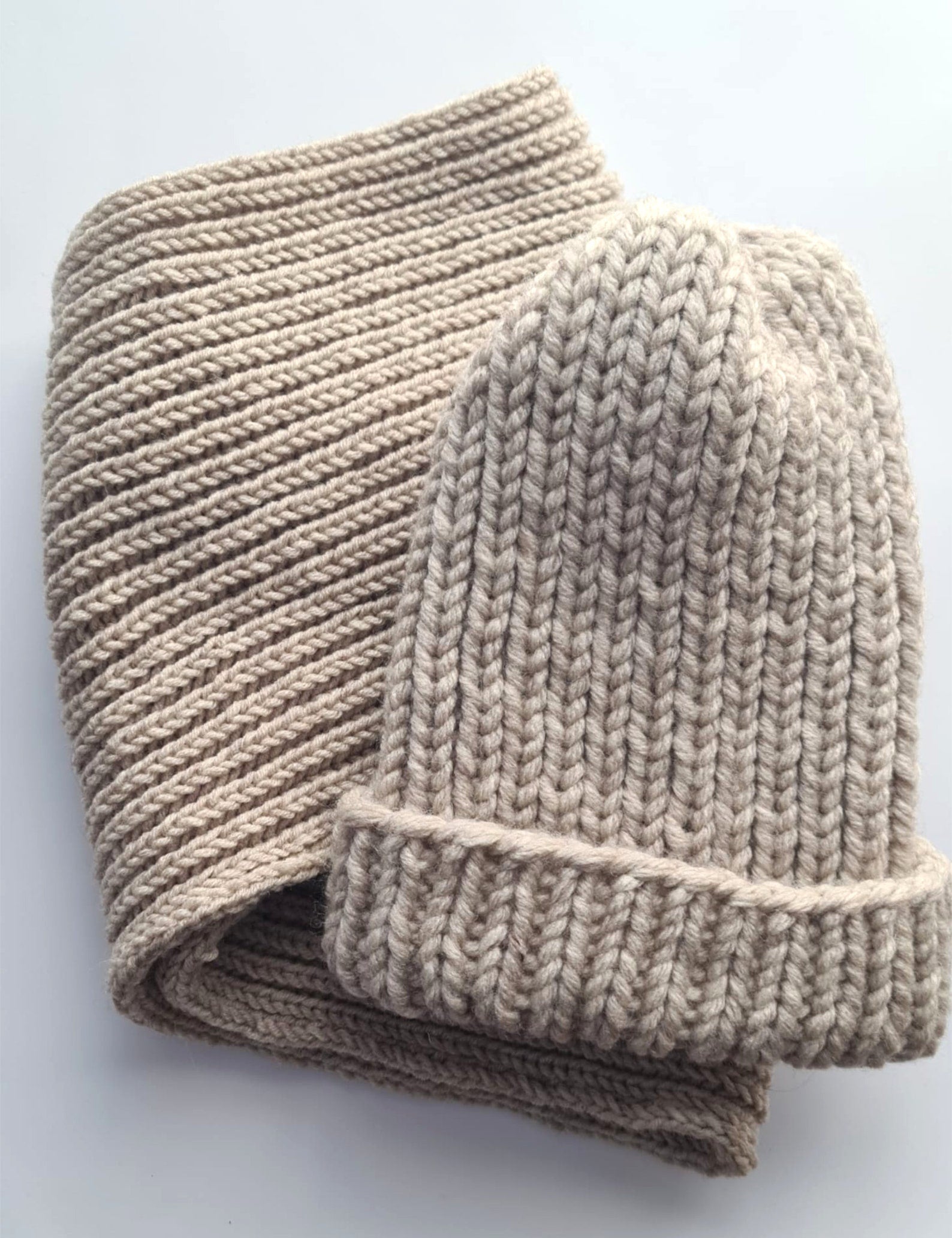 2 piece set of beige knitted hat and infinity scarf