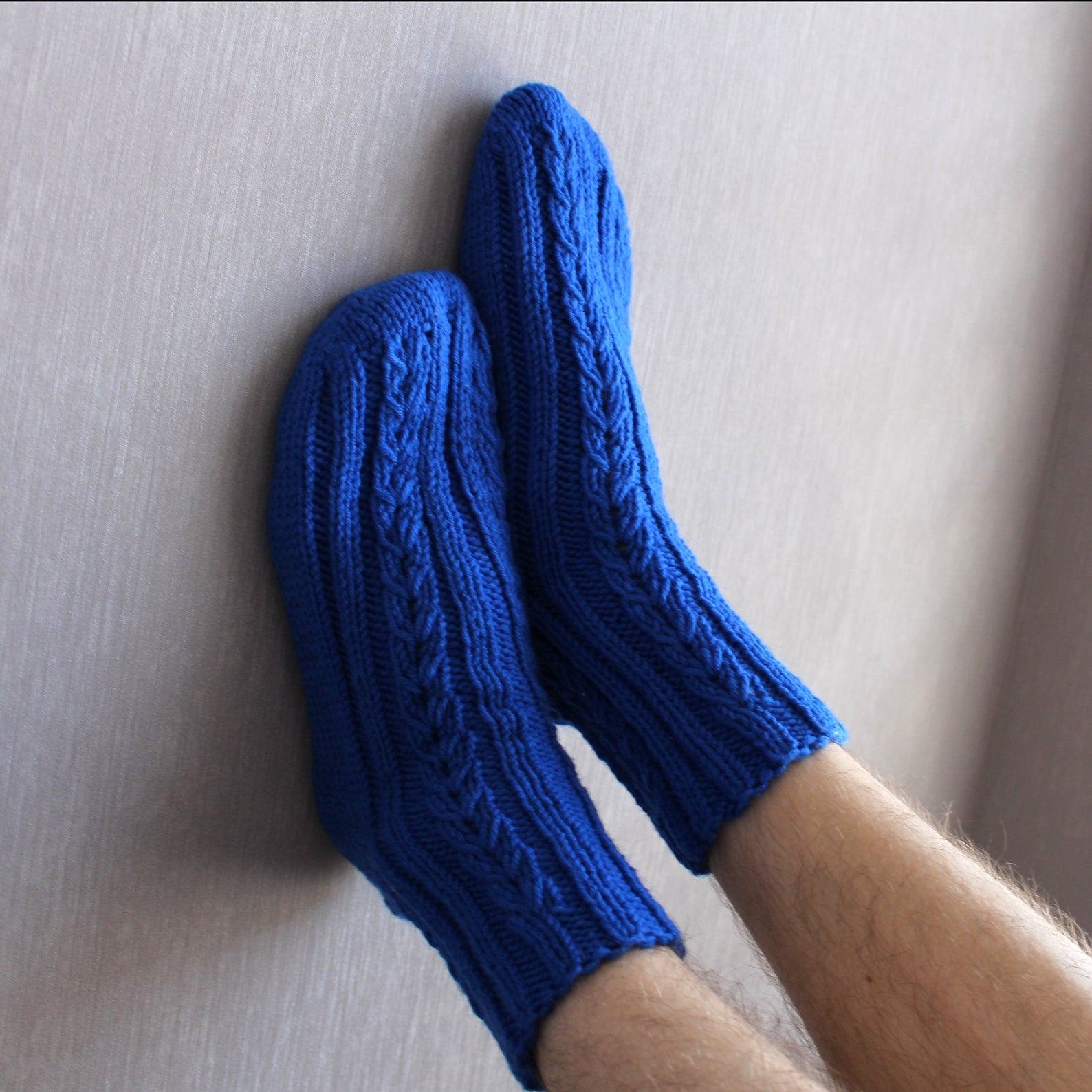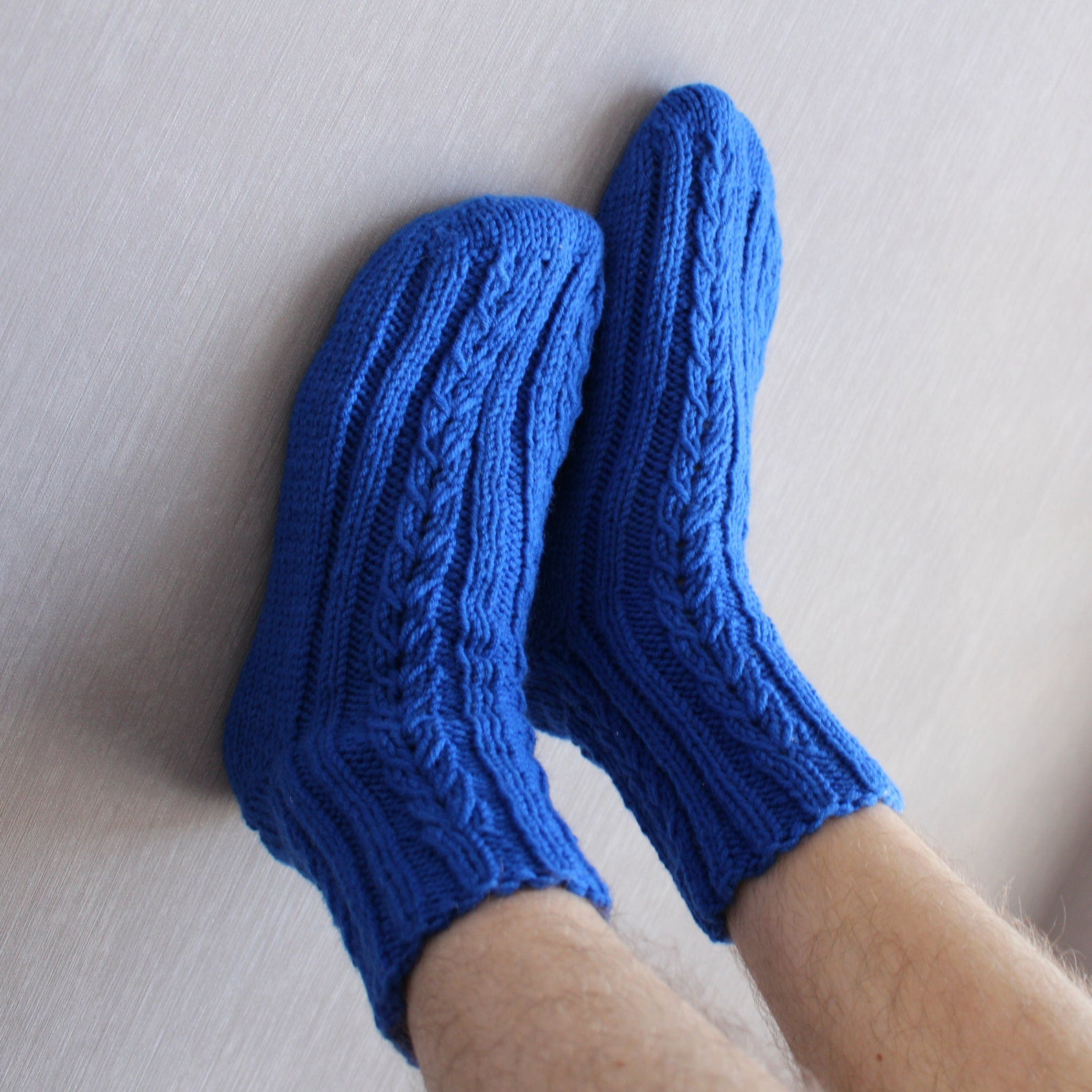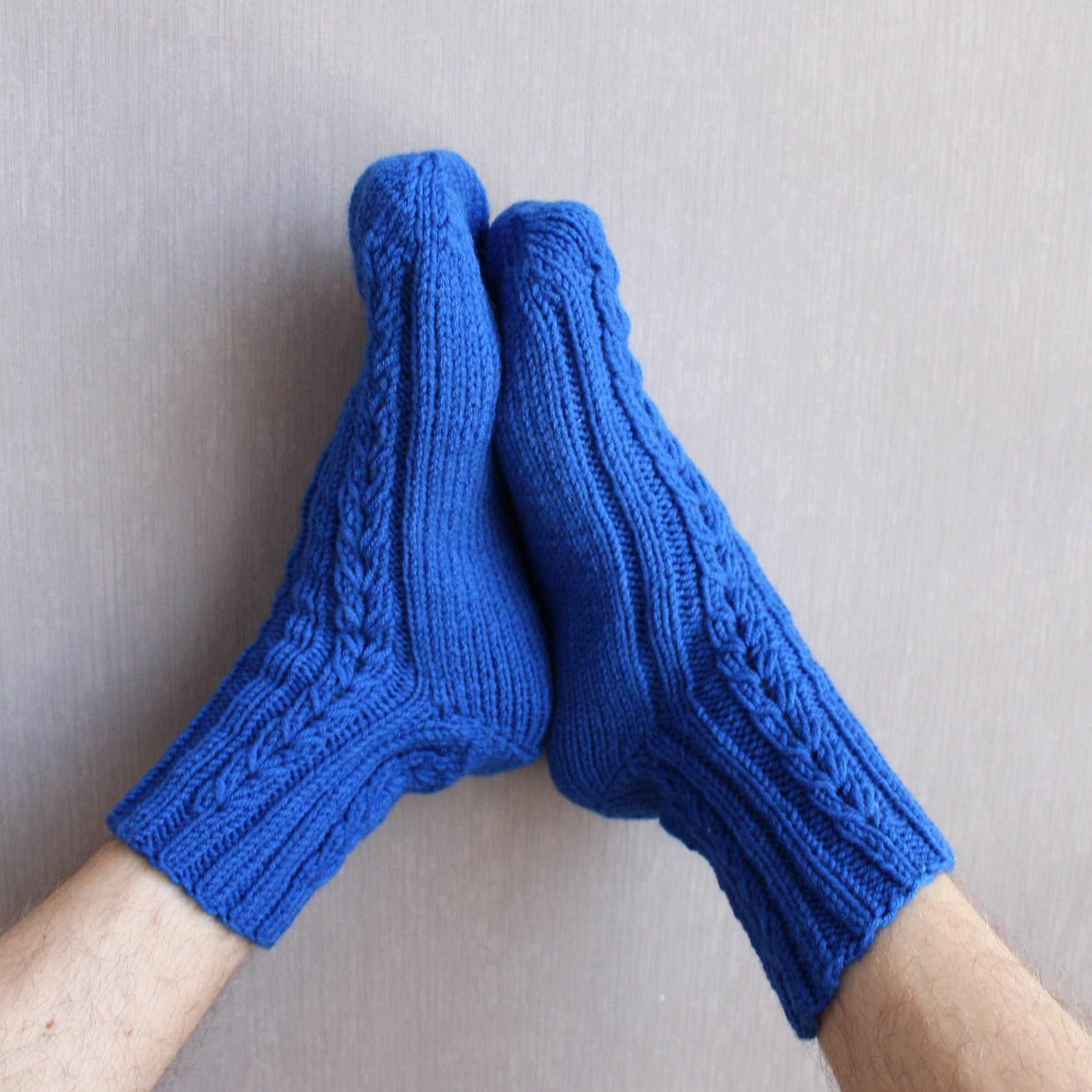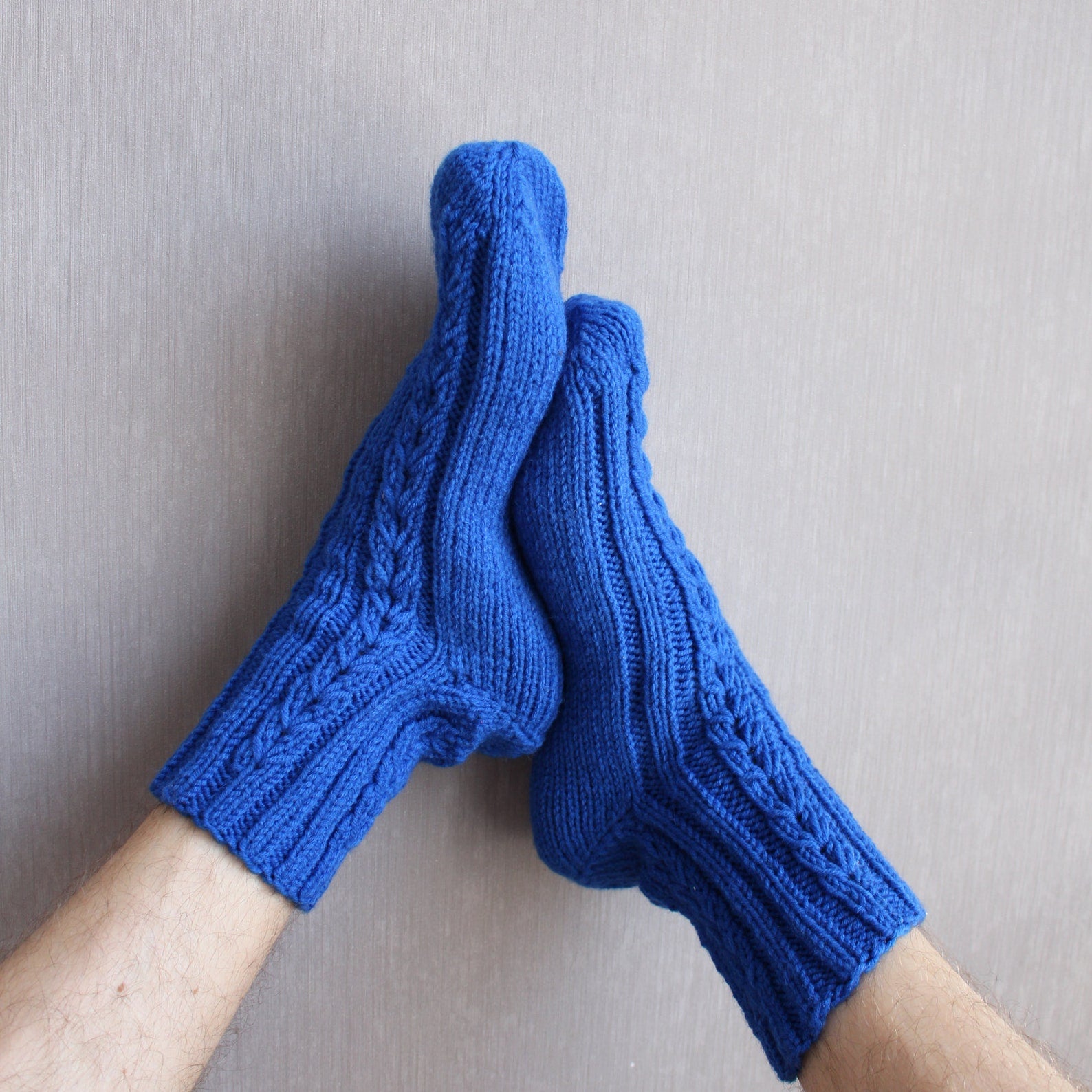 Blue Large Size Socks, Men's Socks for Large Feet, Cable Knit Wool Socks