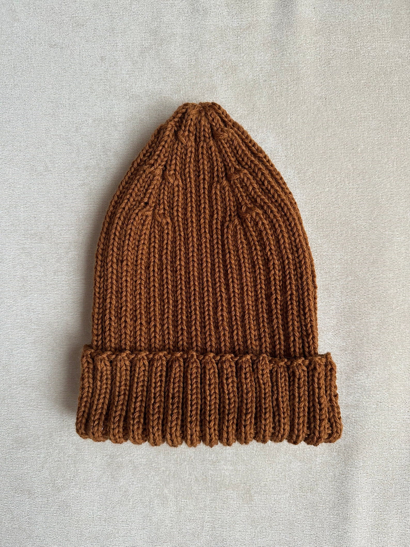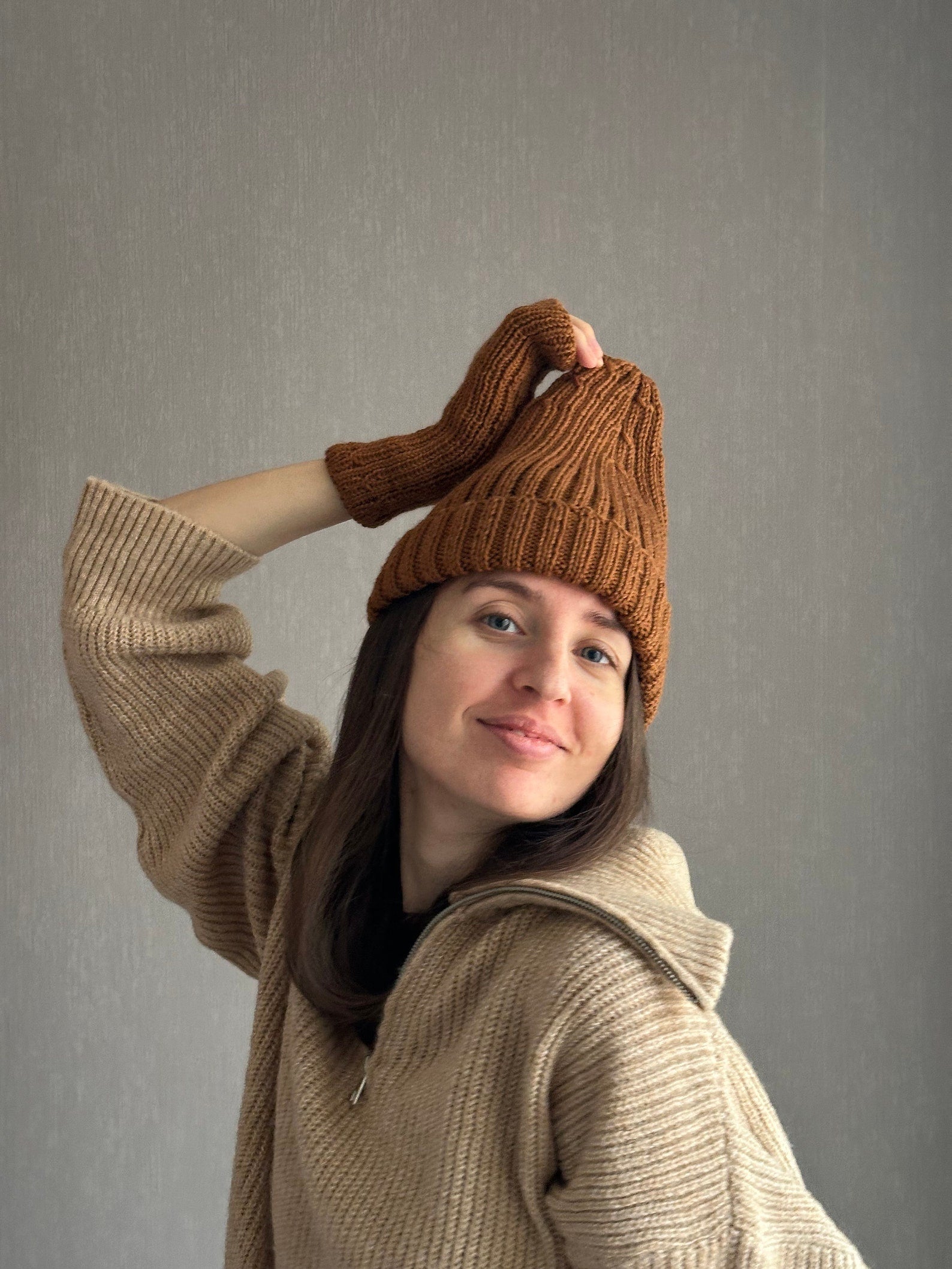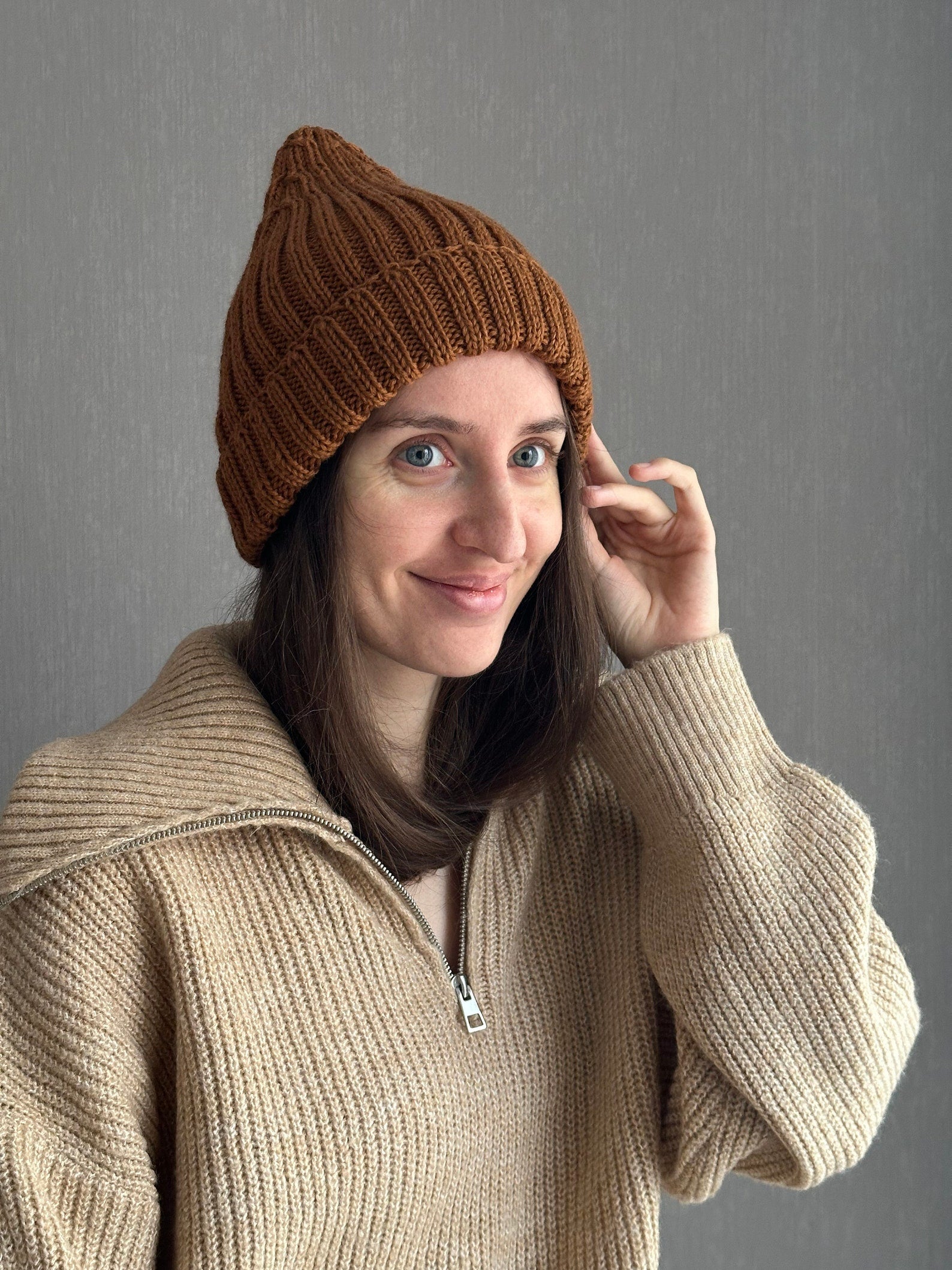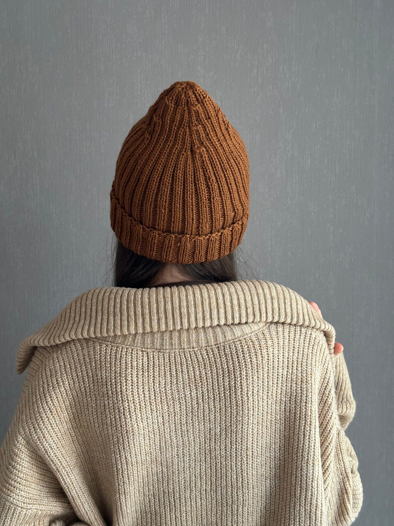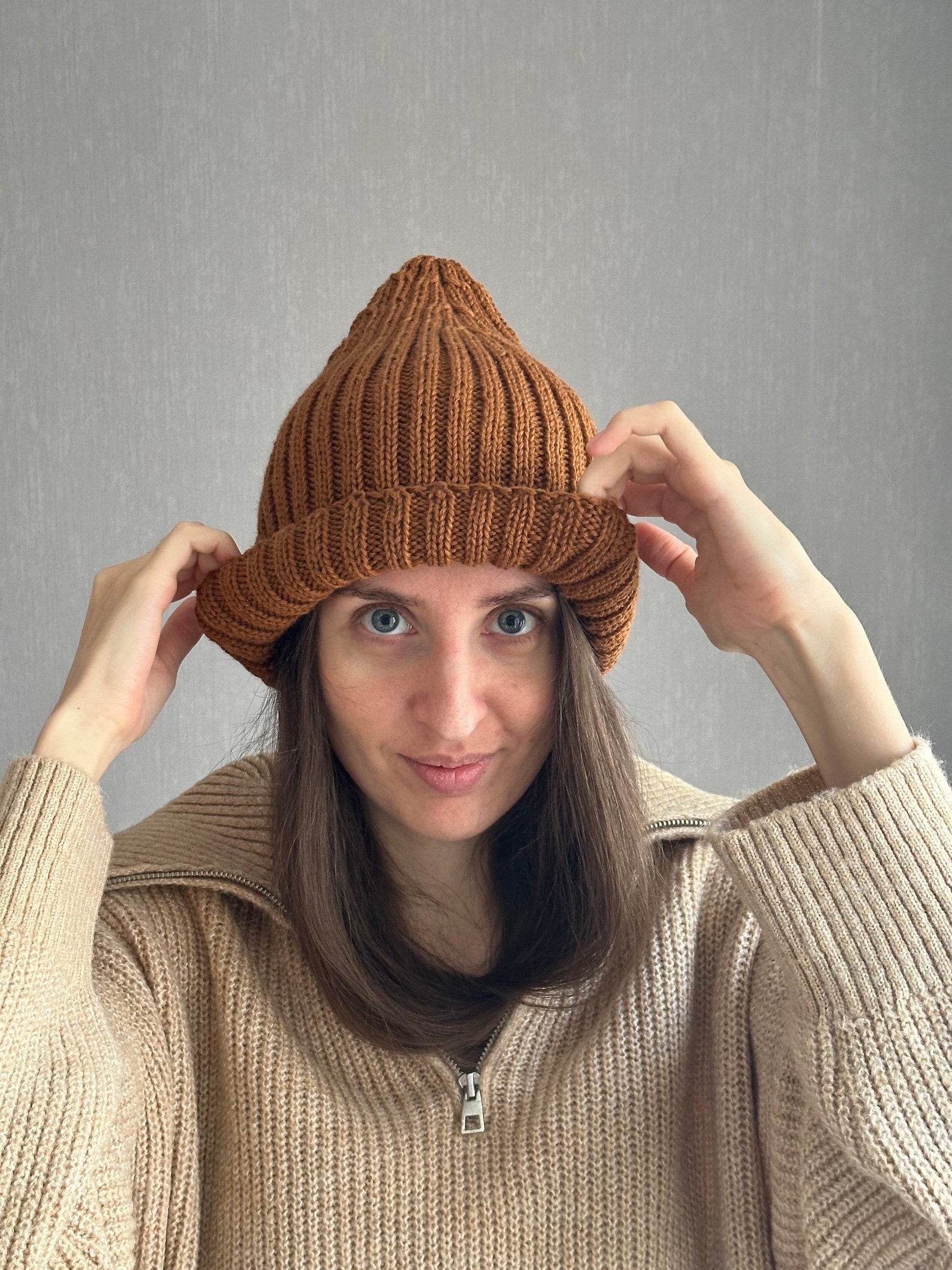 Classic Brown Wool Beanie Hat with Lapel, Cozy Hand-Knit Winter Cap