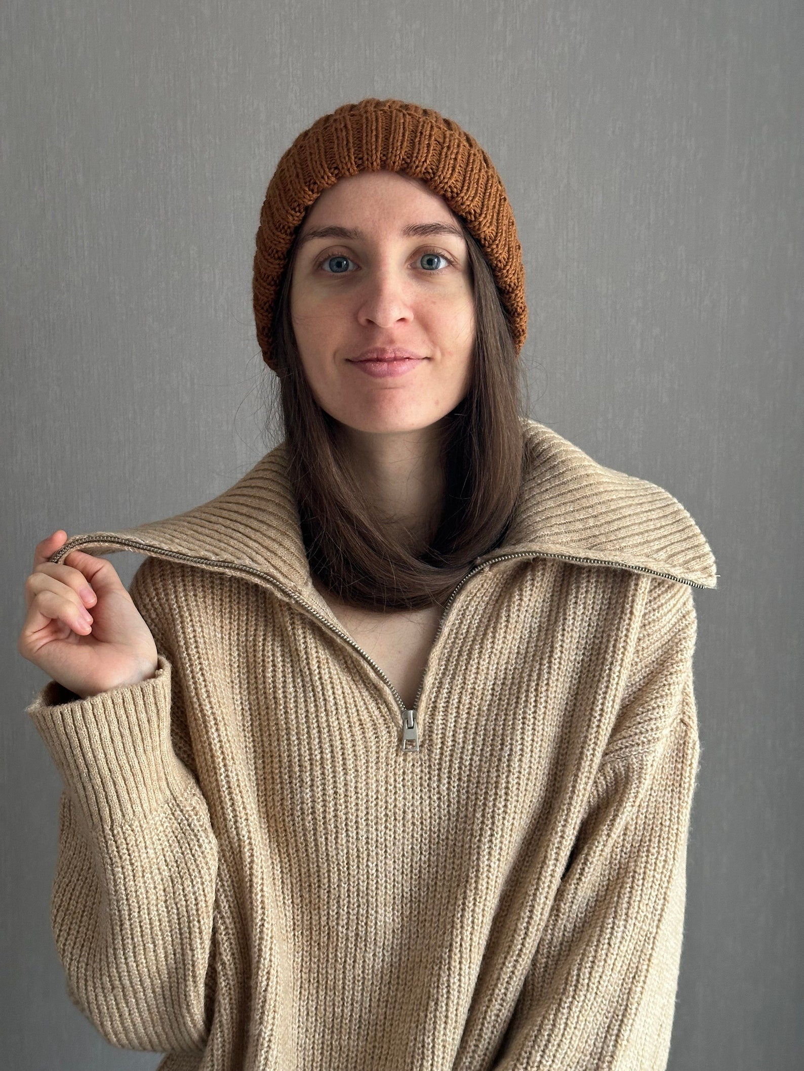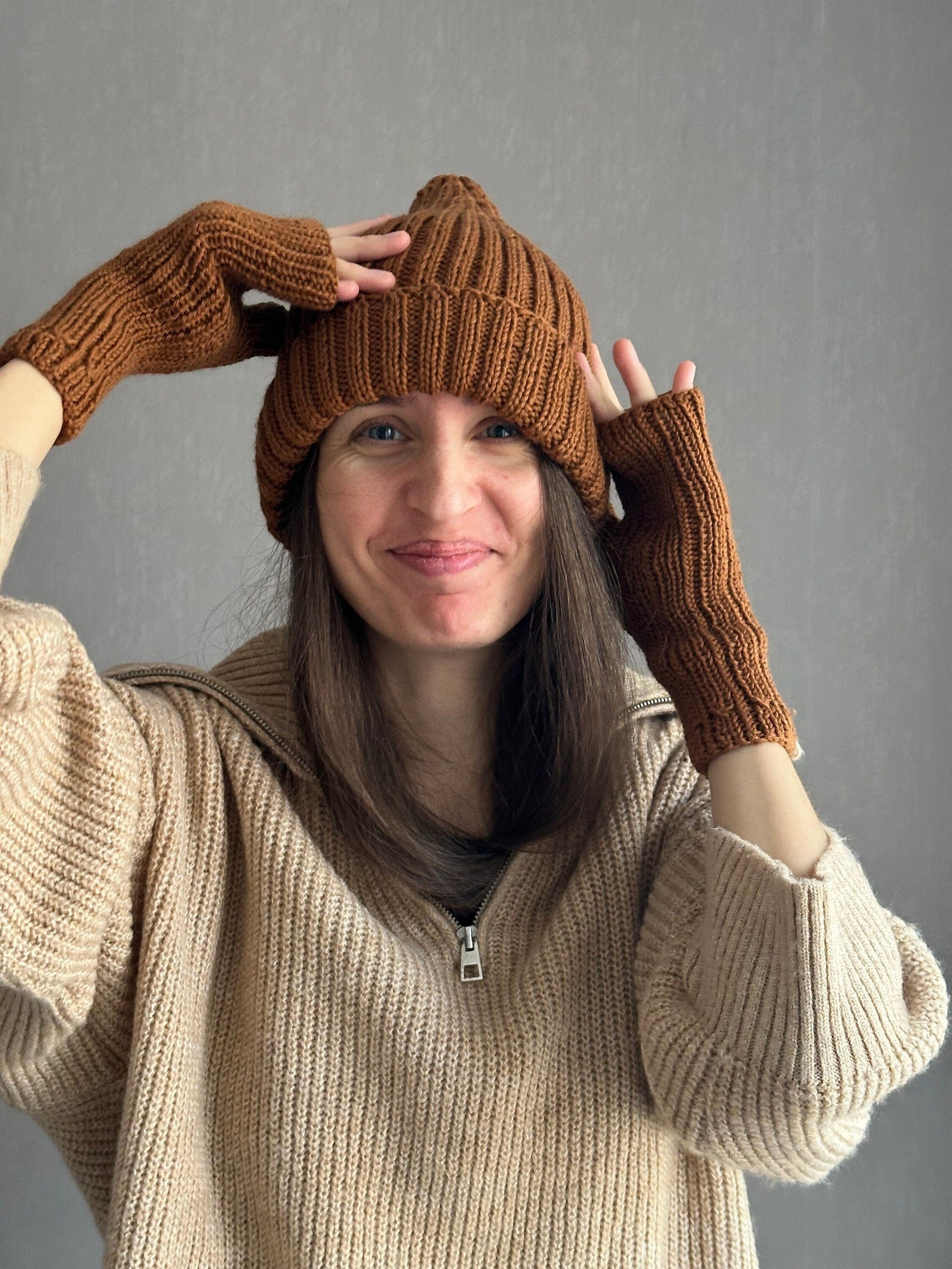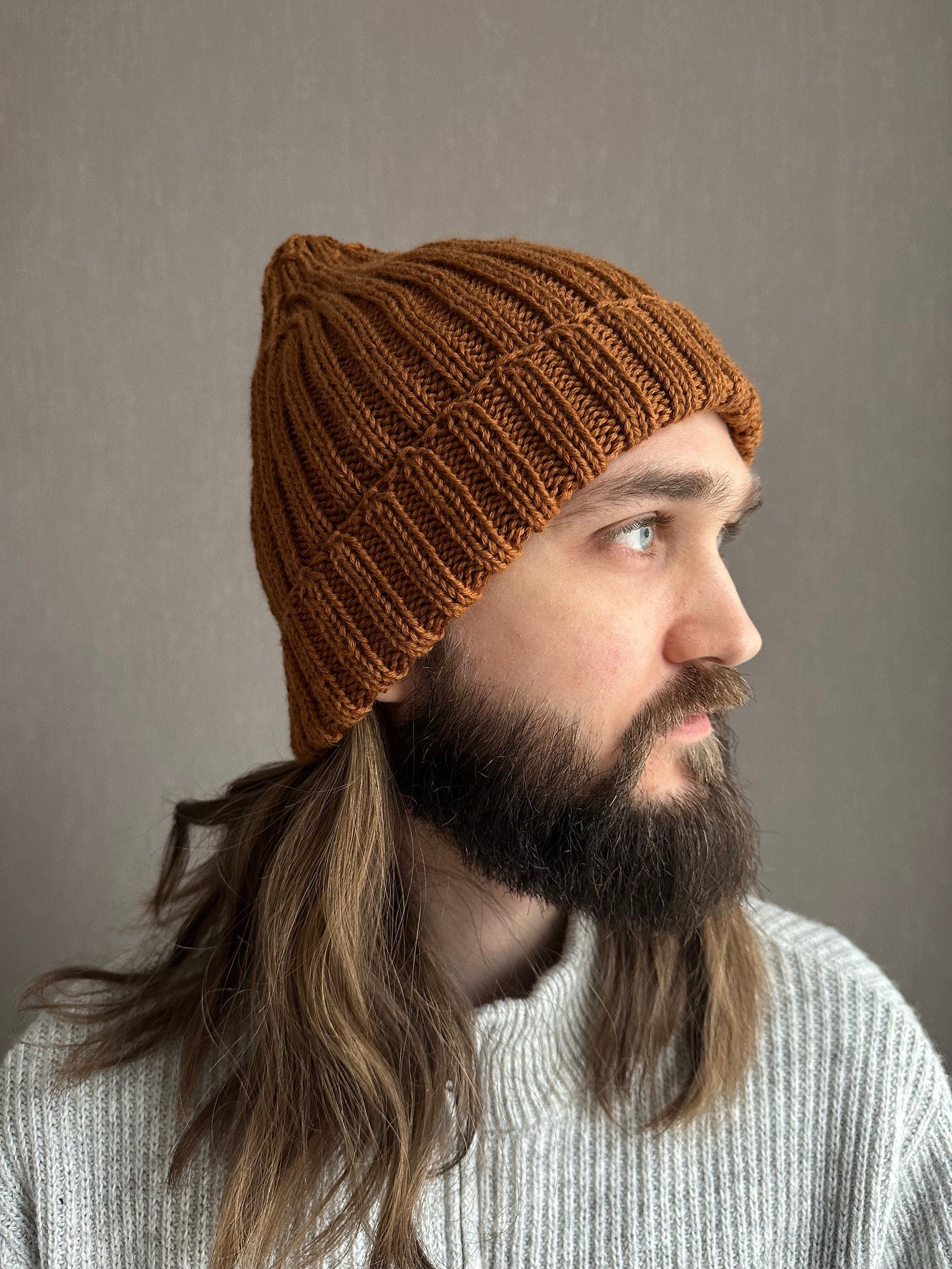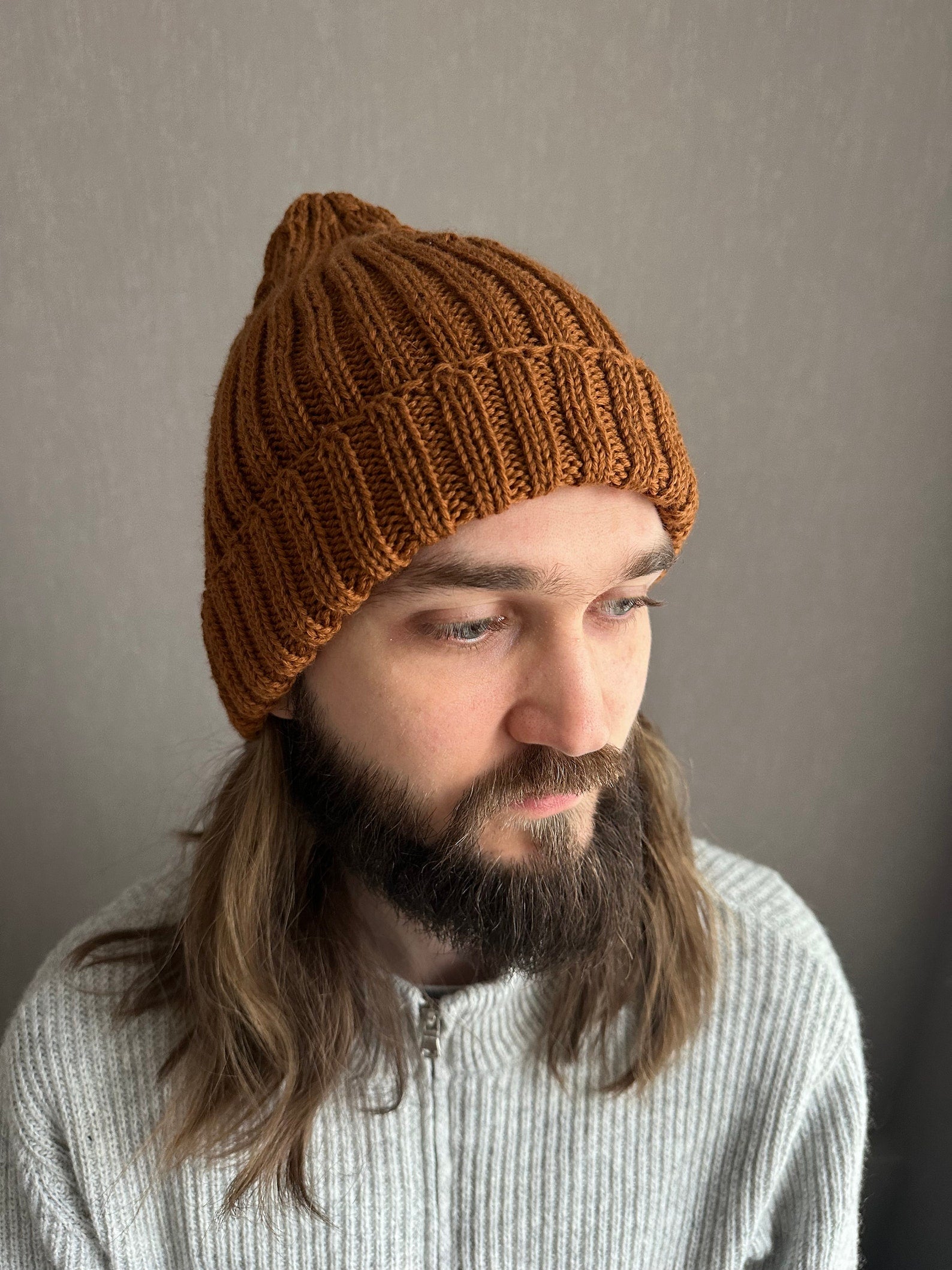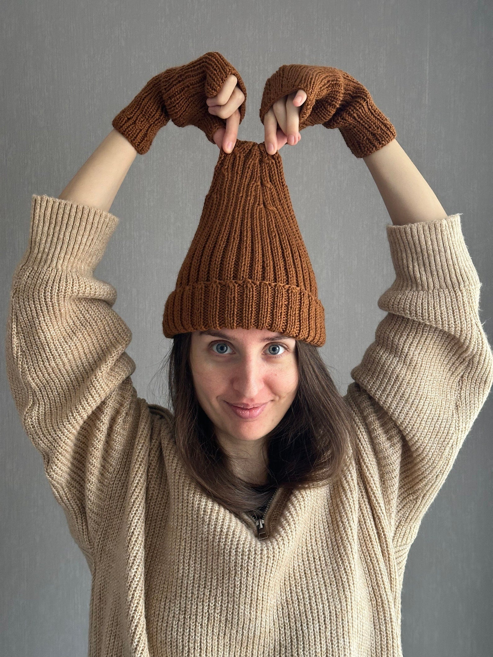 Classic Brown Wool Beanie Hat with Lapel, Cozy Hand-Knit Winter Cap