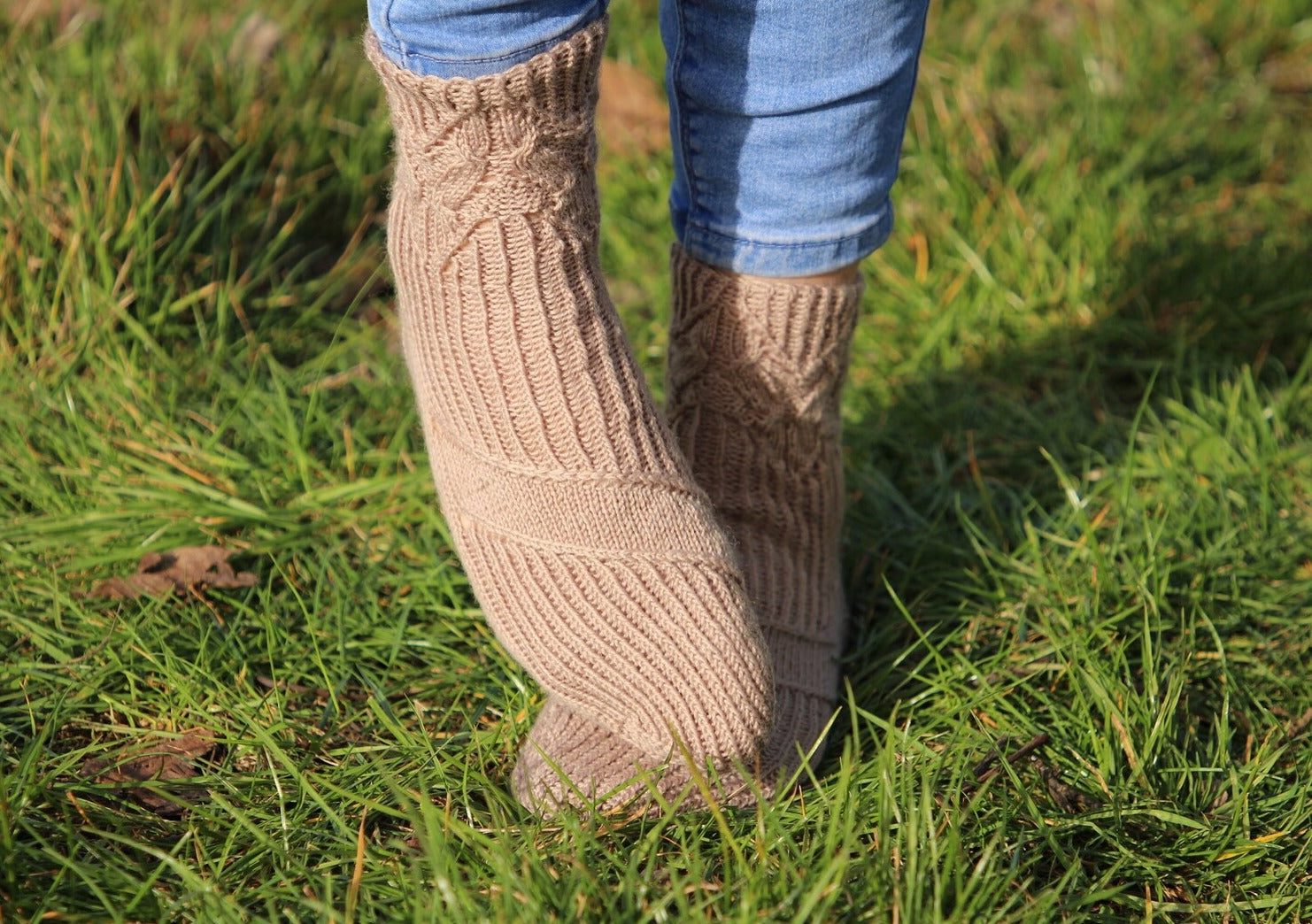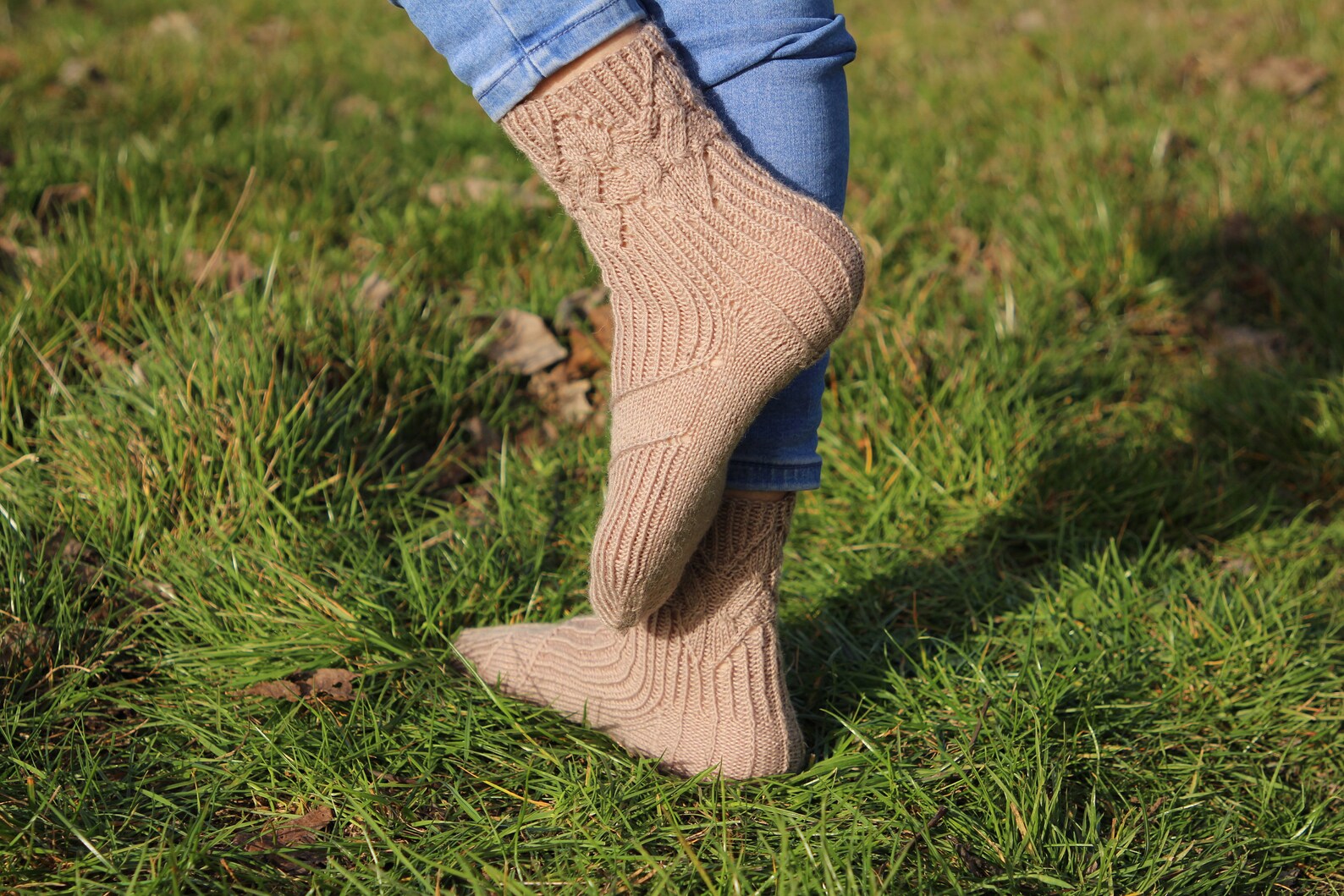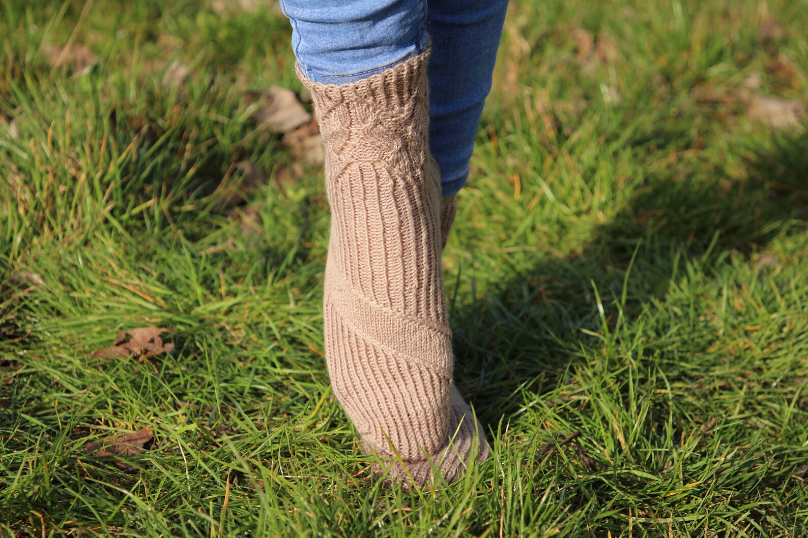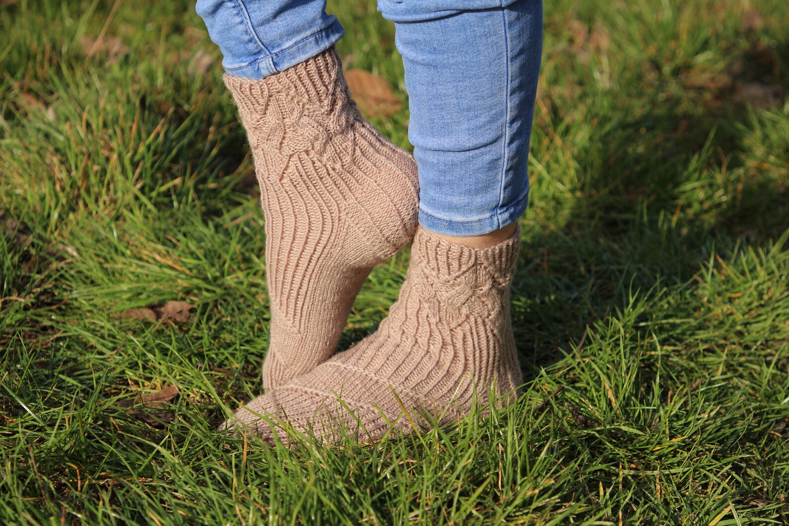 Lovingly hand-knitted, these beige socks feature a classic ribbed design with an intricate cable pattern that adds both texture and elegance to your daily wear.
