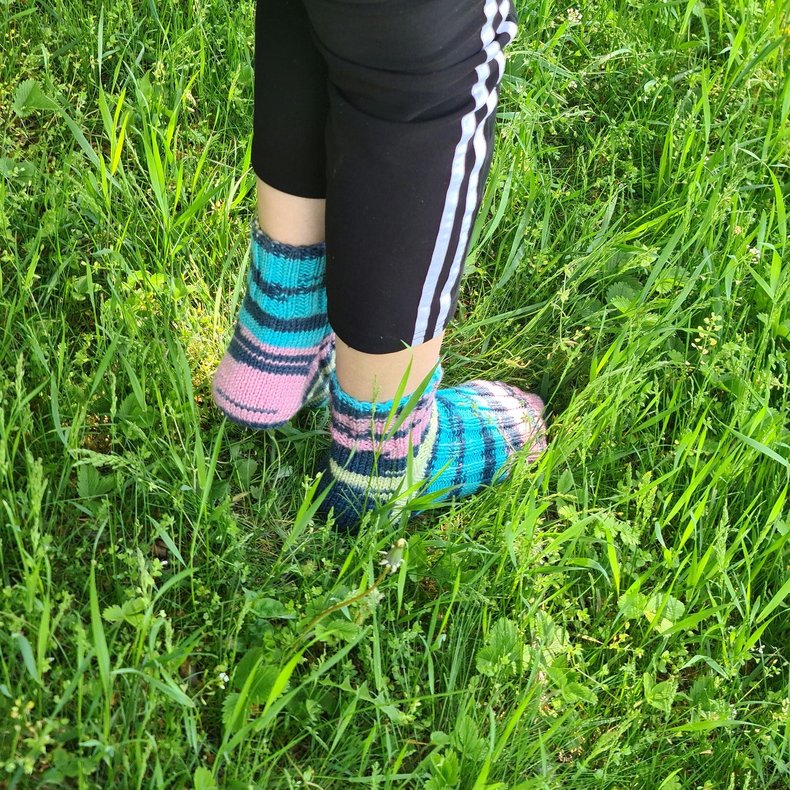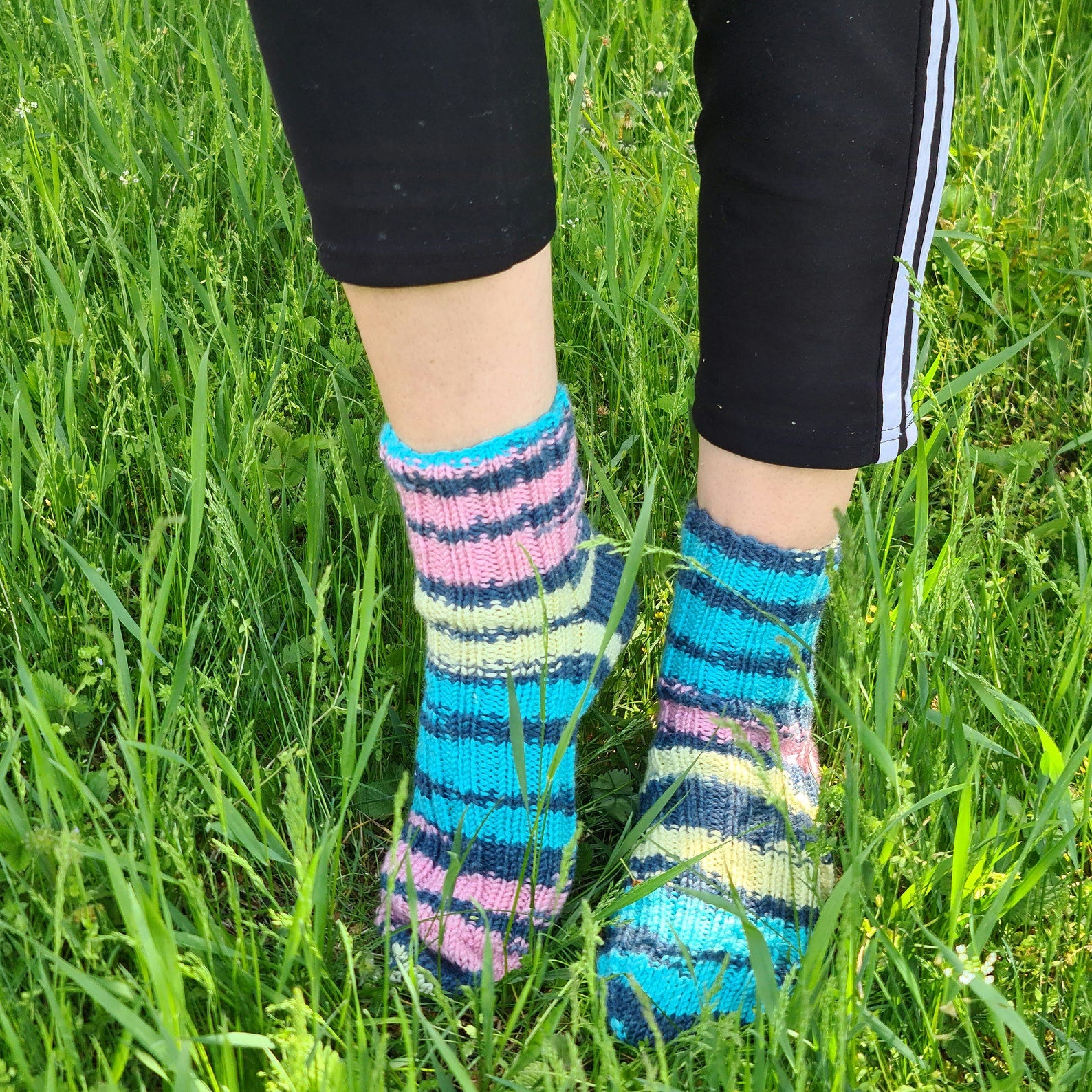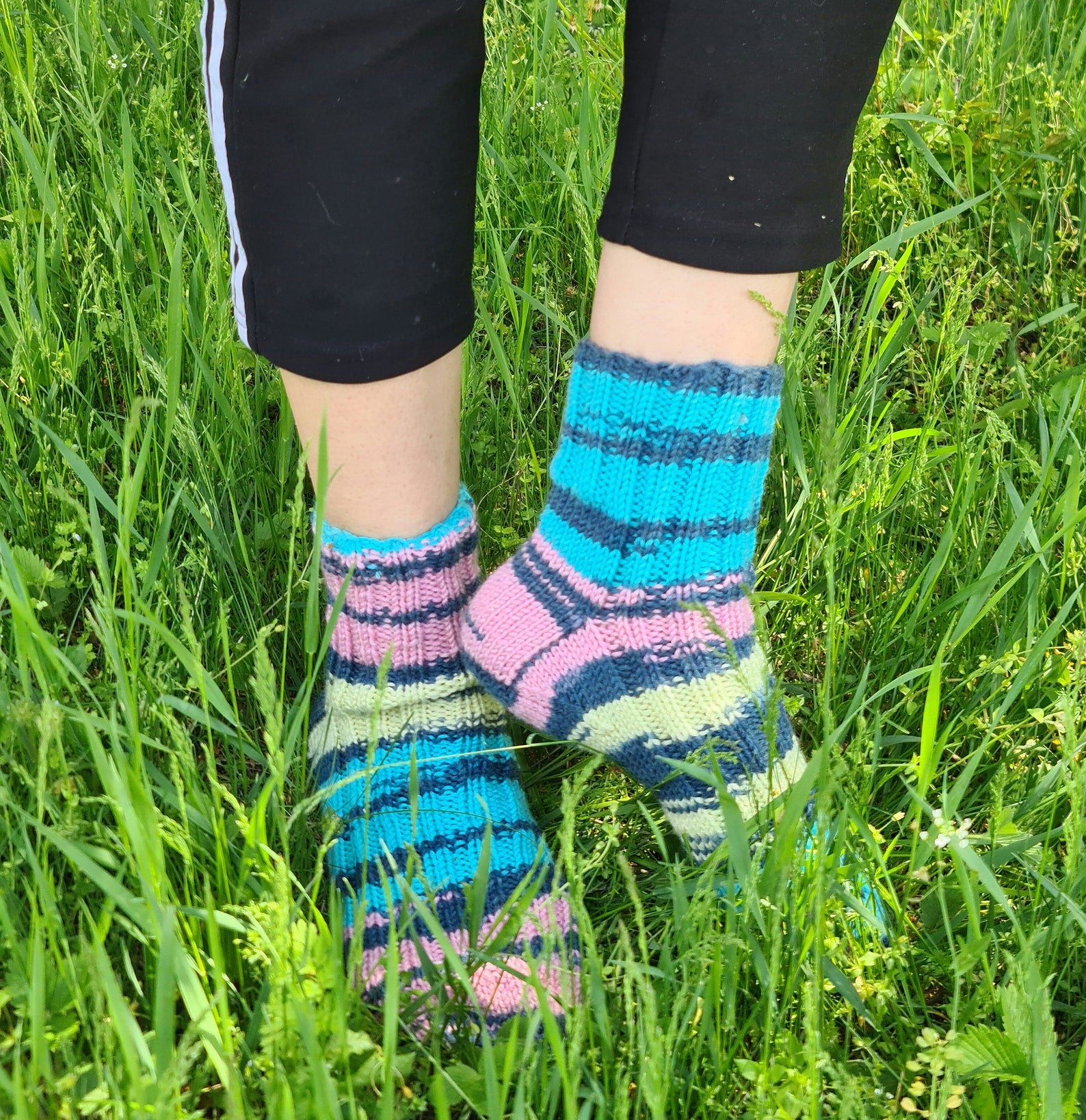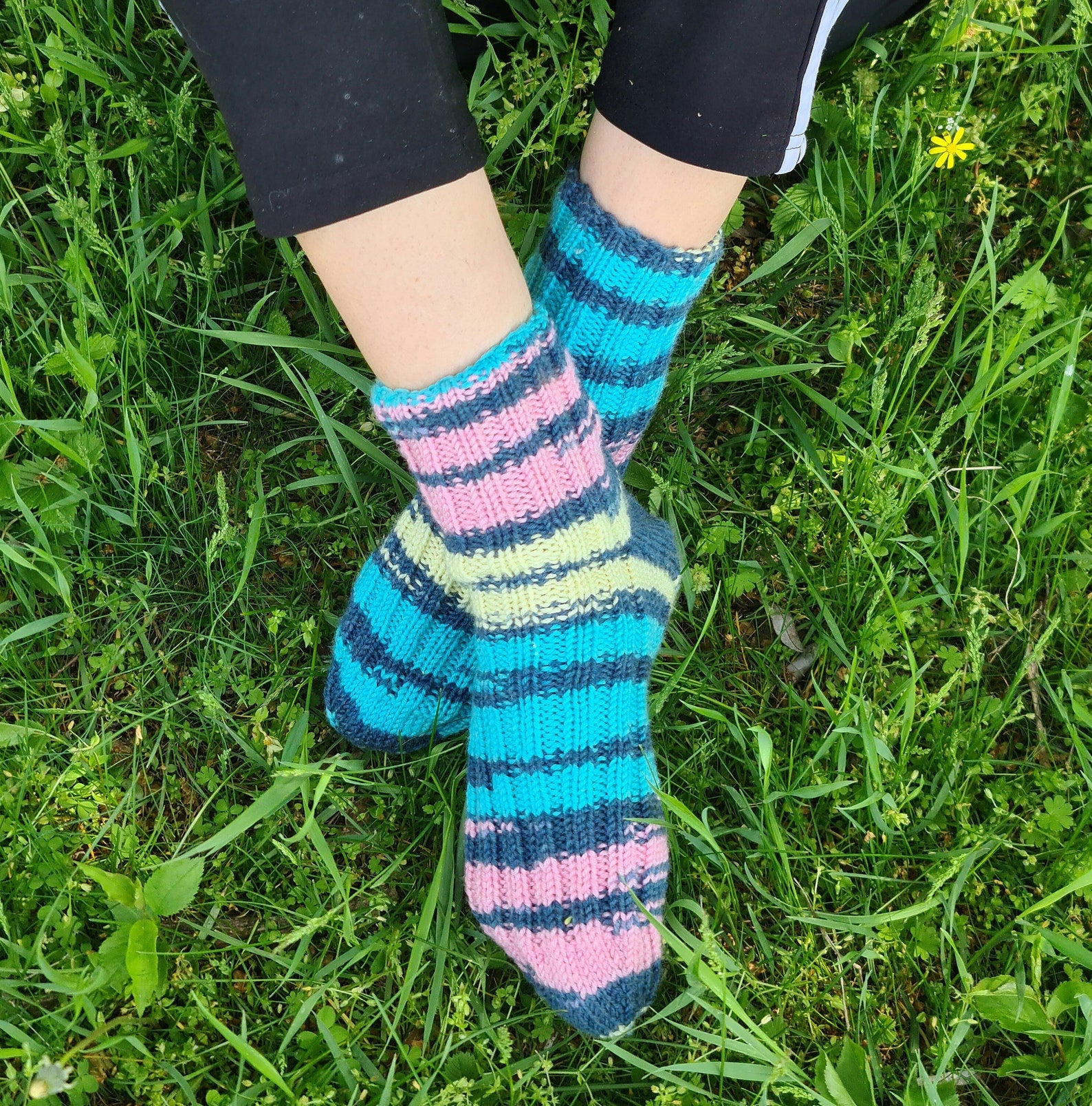 Hand-knit striped multicolor mismatched socks from premium 70% wool and 30% acrylic yarn. They're soft and warm, but also durable because of the high-quality materials, ensuring they will last you many years to come.