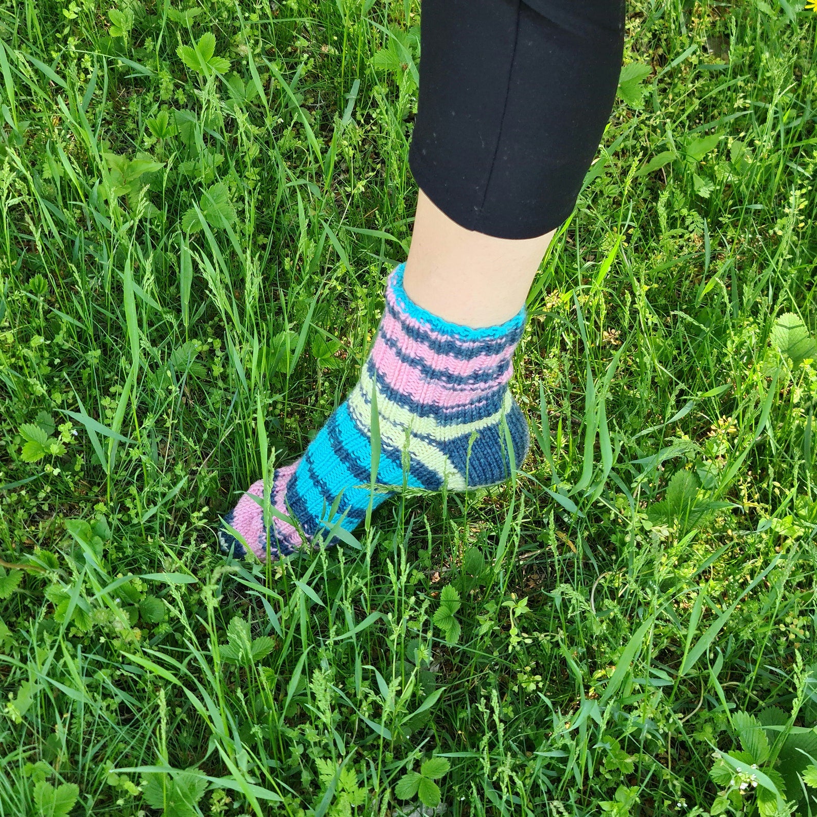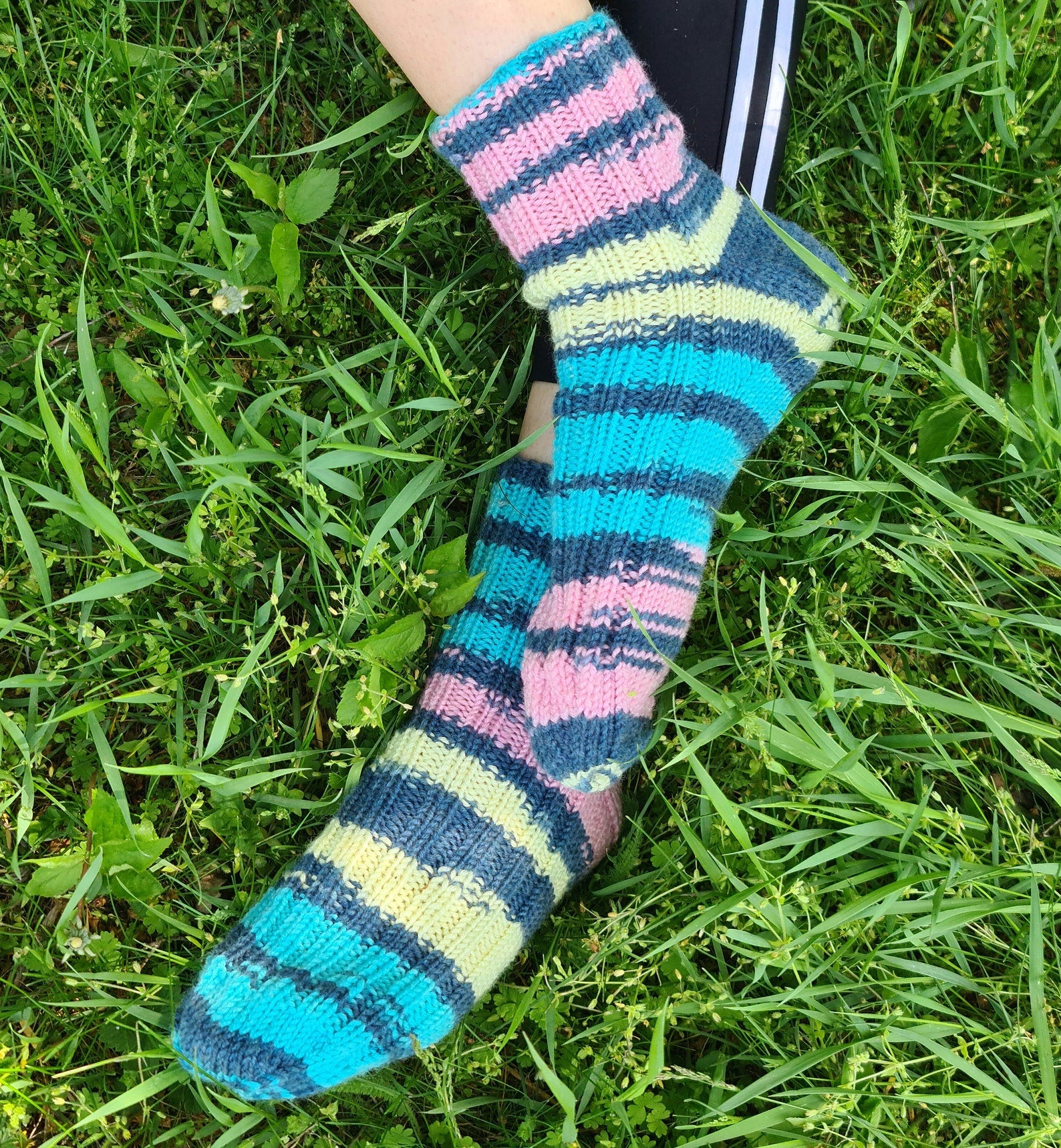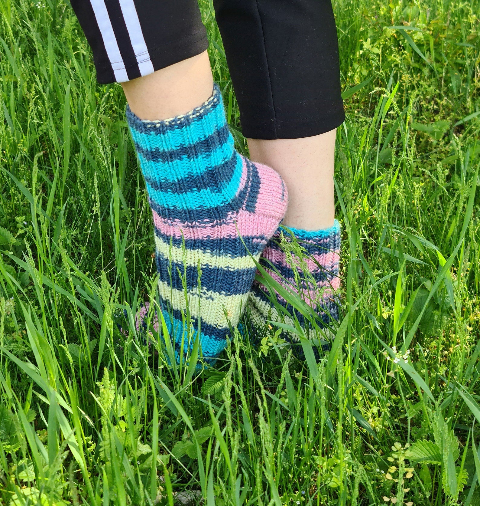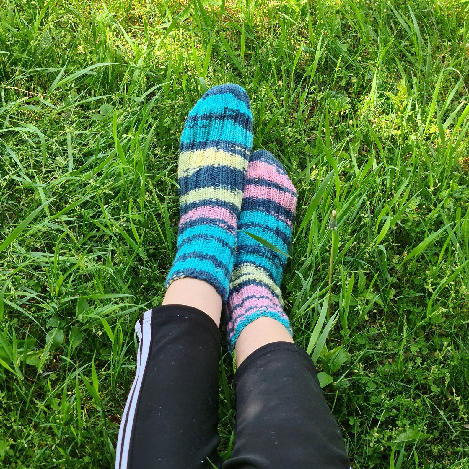 Hand-knit striped multicolor mismatched socks from premium 70% wool and 30% acrylic yarn. They're soft and warm, but also durable because of the high-quality materials, ensuring they will last you many years to come.