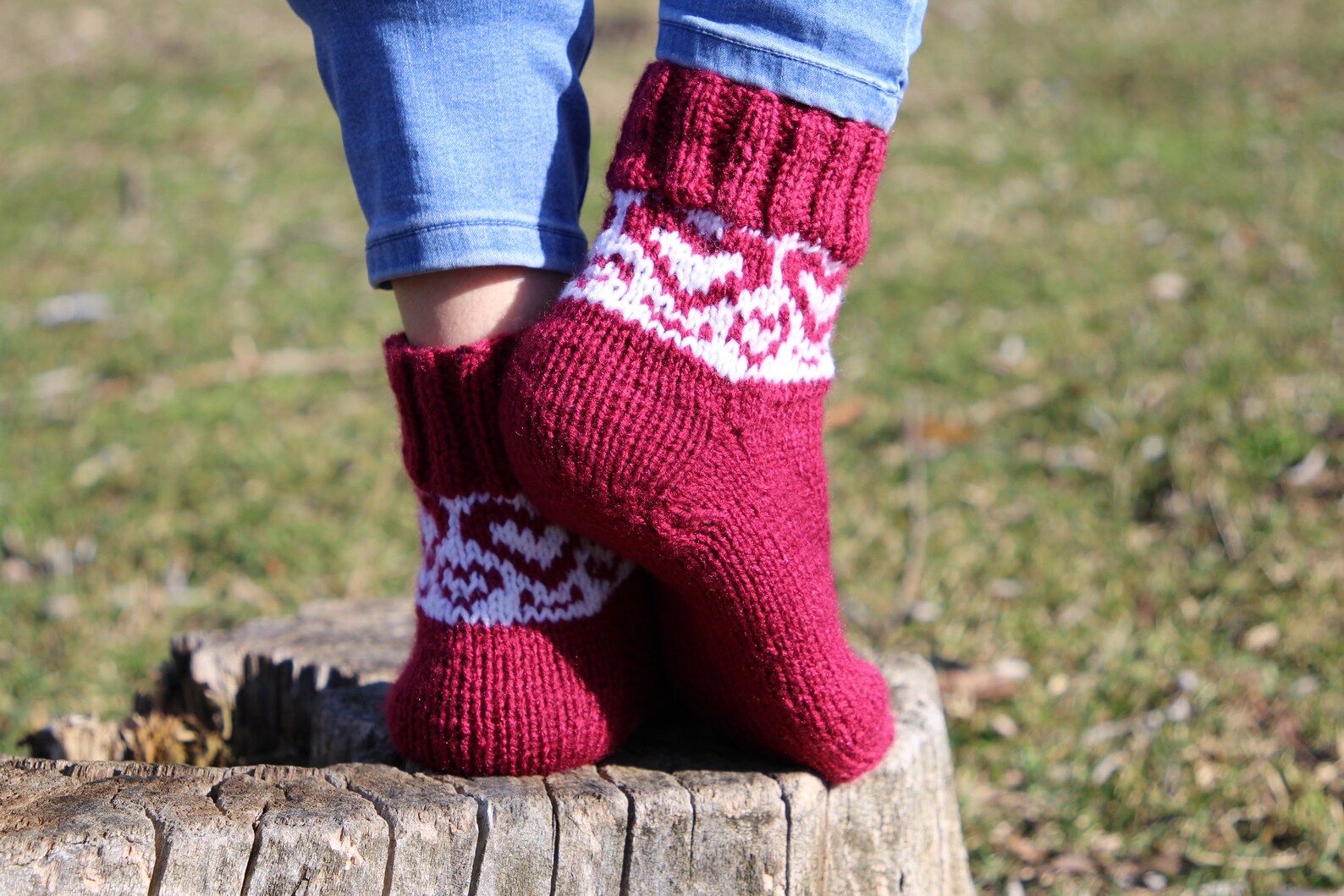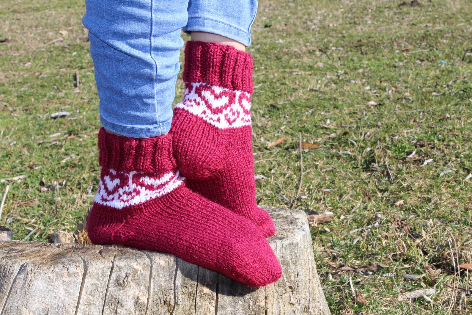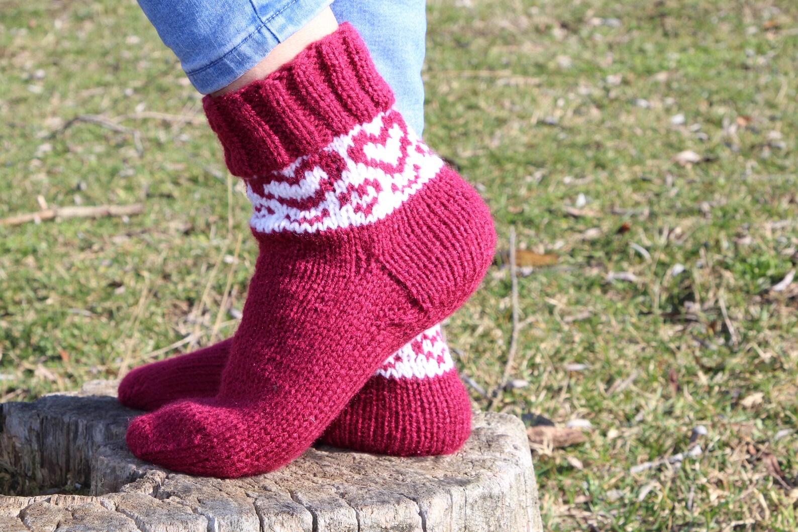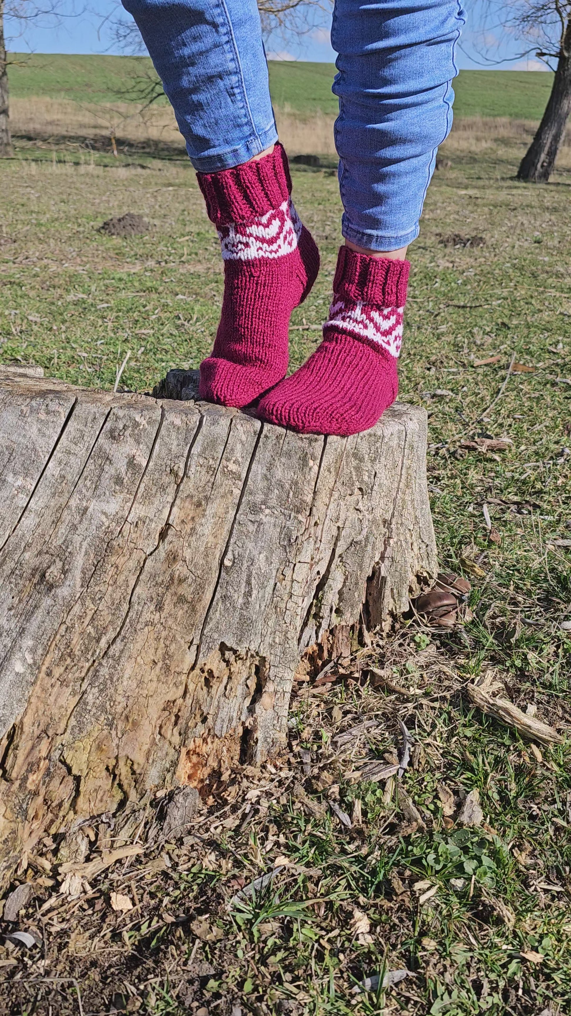 Embrace the cooler weather with these charming handmade burgundy casual socks, adorned with a delightful white heart pattern that adds a touch of love to your daily wear. Crafted with cozy pure acrylic yarn, these socks provide warmth without sacrificing style.