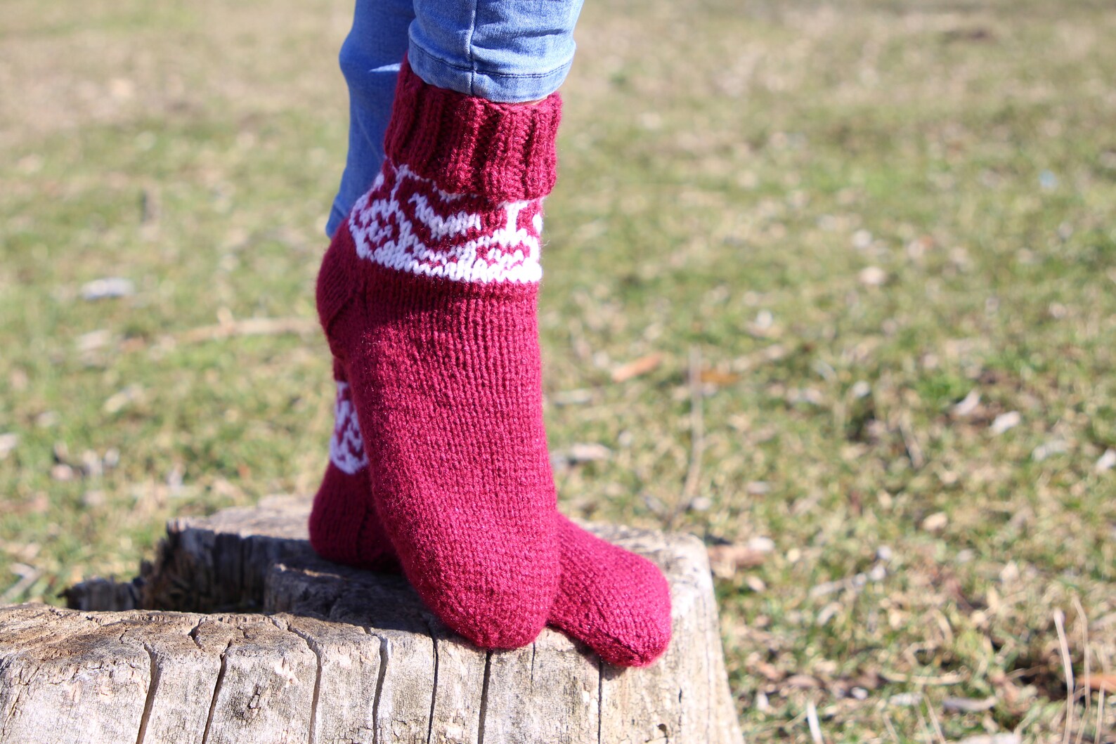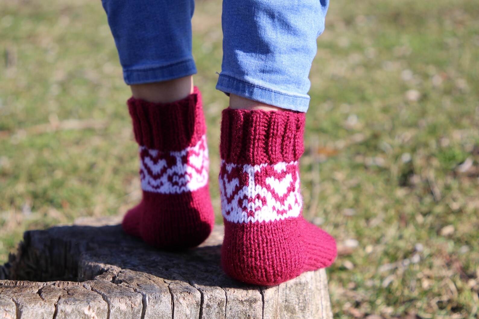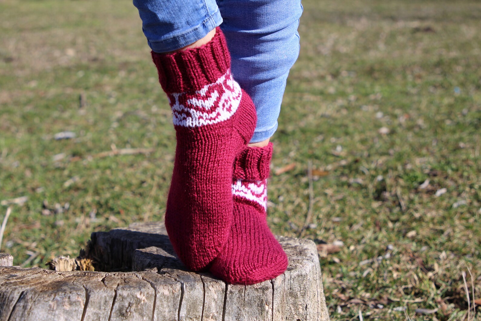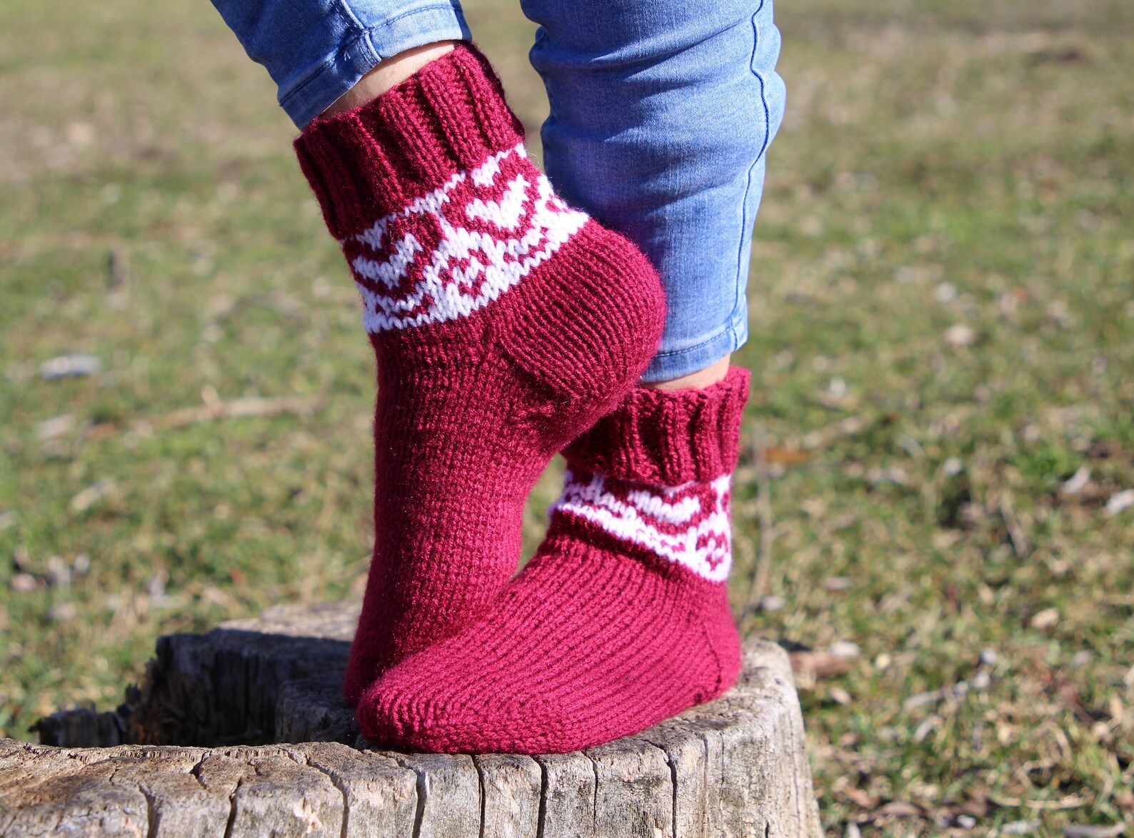 Embrace the cooler weather with these charming handmade burgundy casual socks, adorned with a delightful white heart pattern that adds a touch of love to your daily wear. Crafted with cozy pure acrylic yarn, these socks provide warmth without sacrificing style.