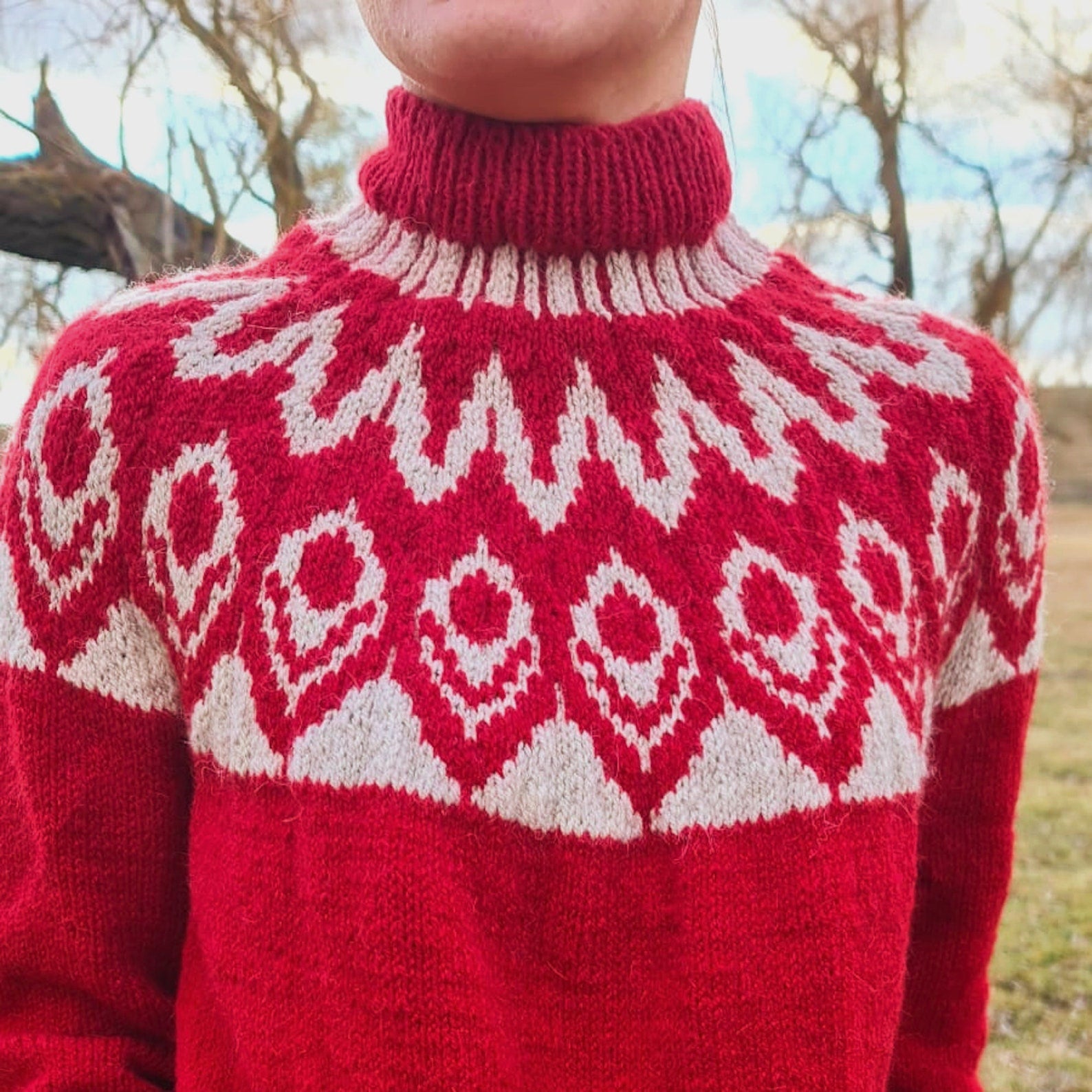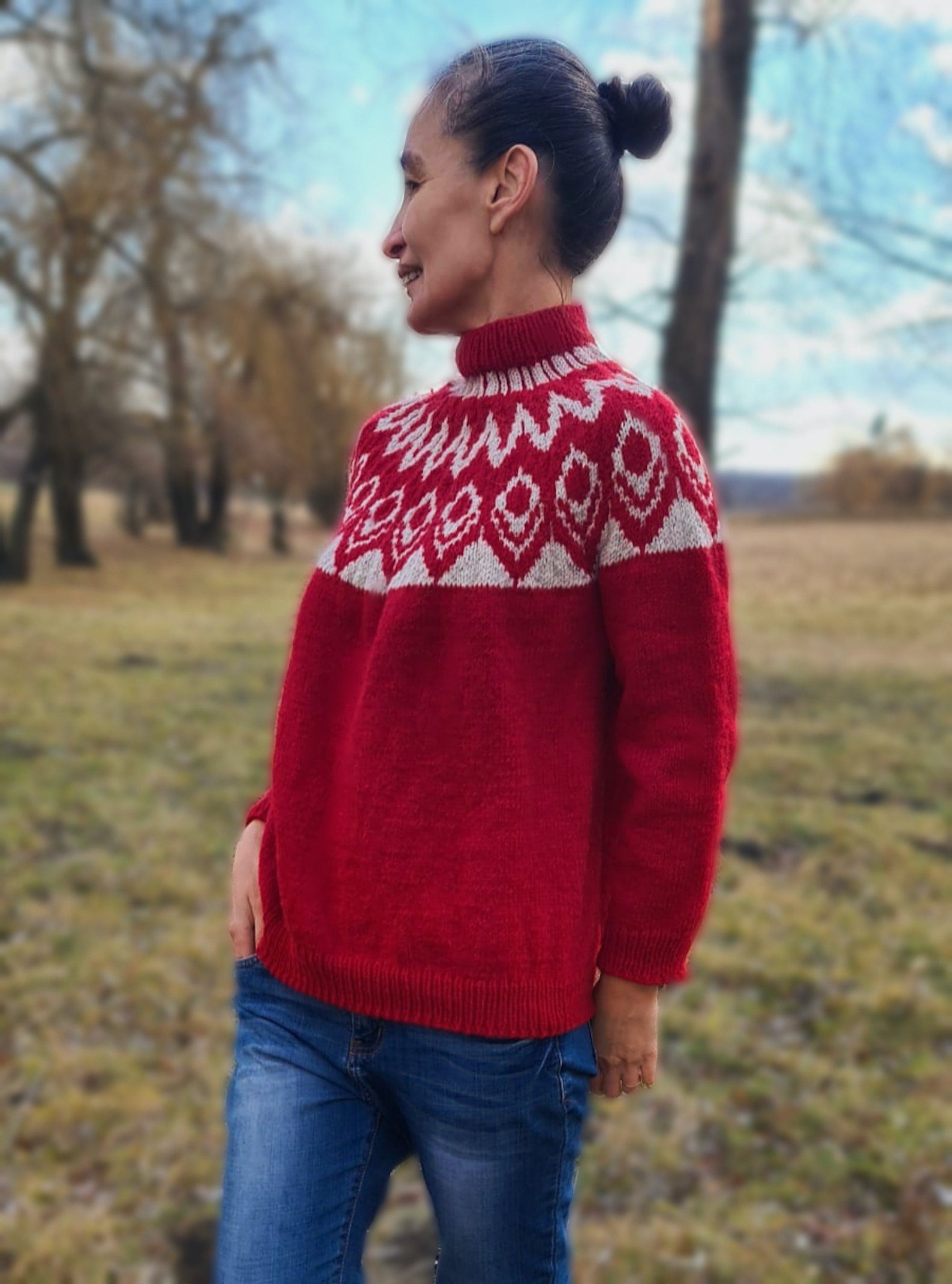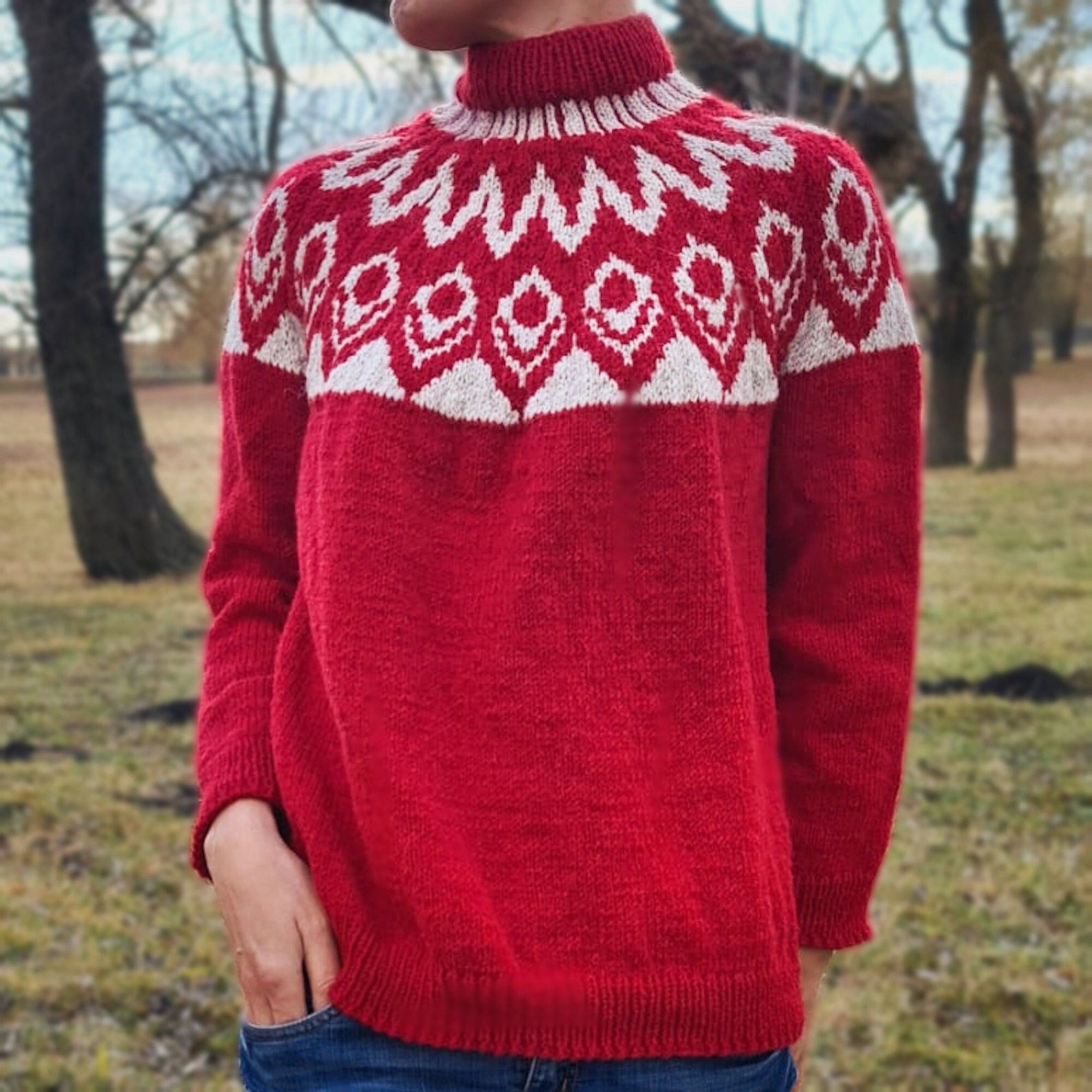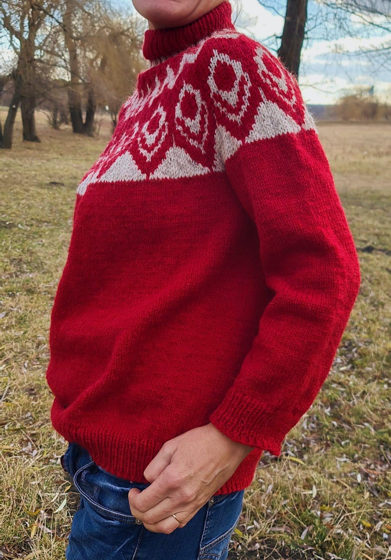 Icelandic Lopi Red Sweater, Fair isle Pullover, Long sleeve Wool Turtleneck