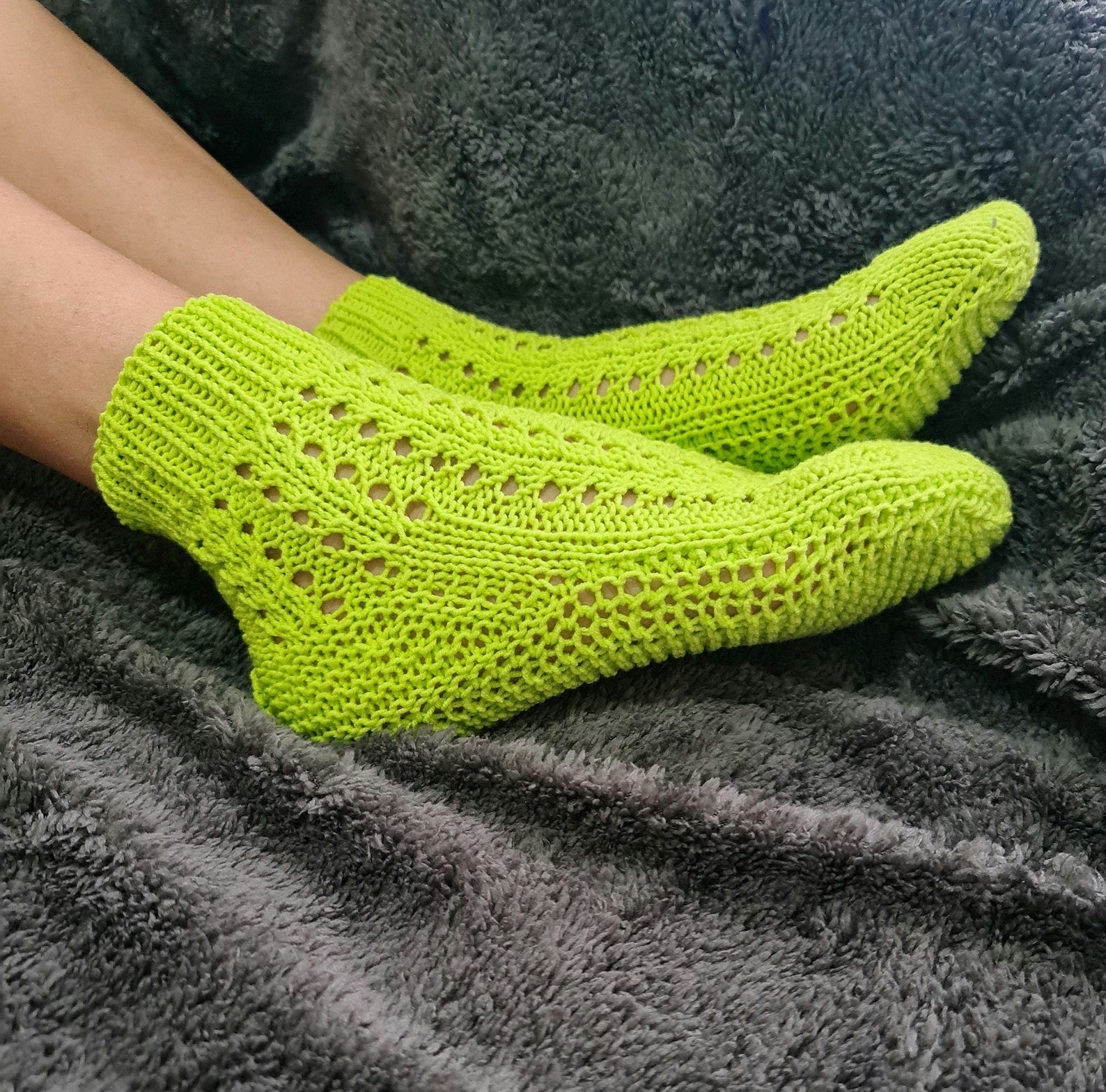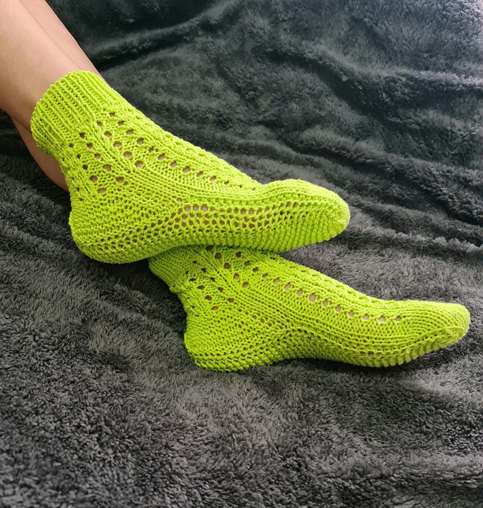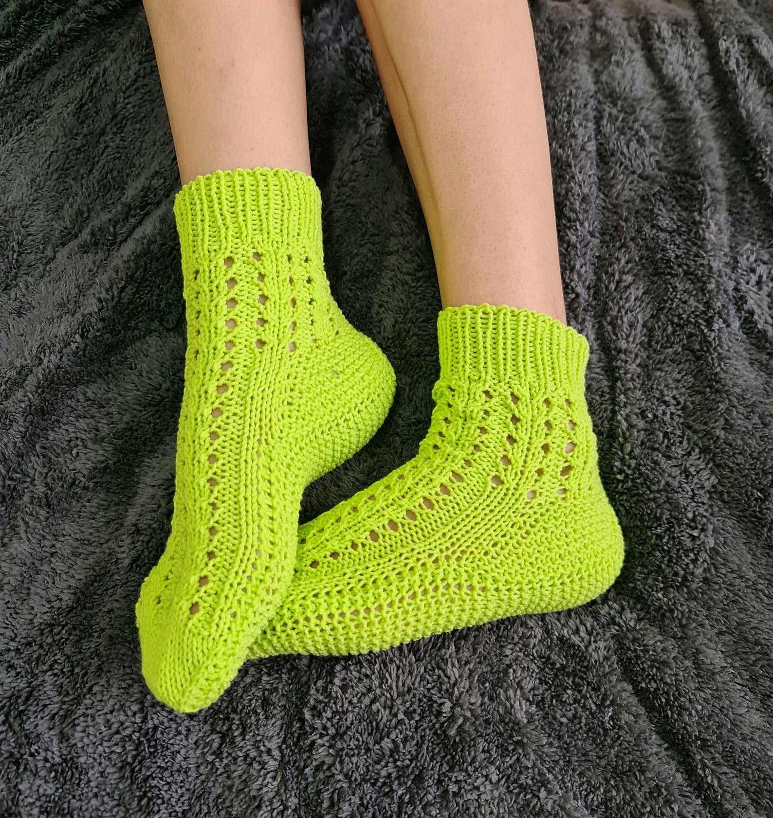Socks were hand-knitted from premium quality cotton yarn. That yarn is usually used for baby garment designs. It's soft and pleasant to the body.