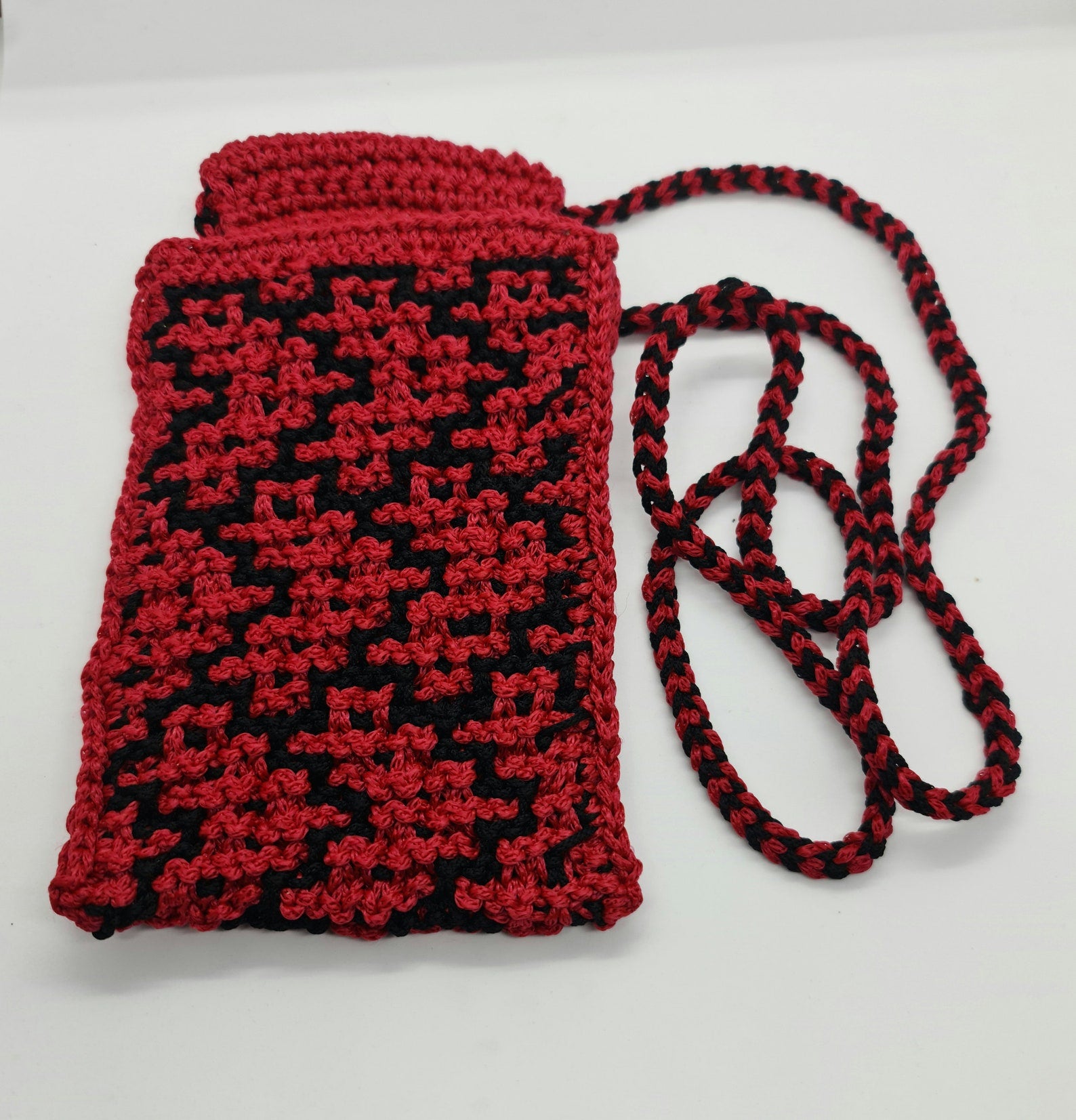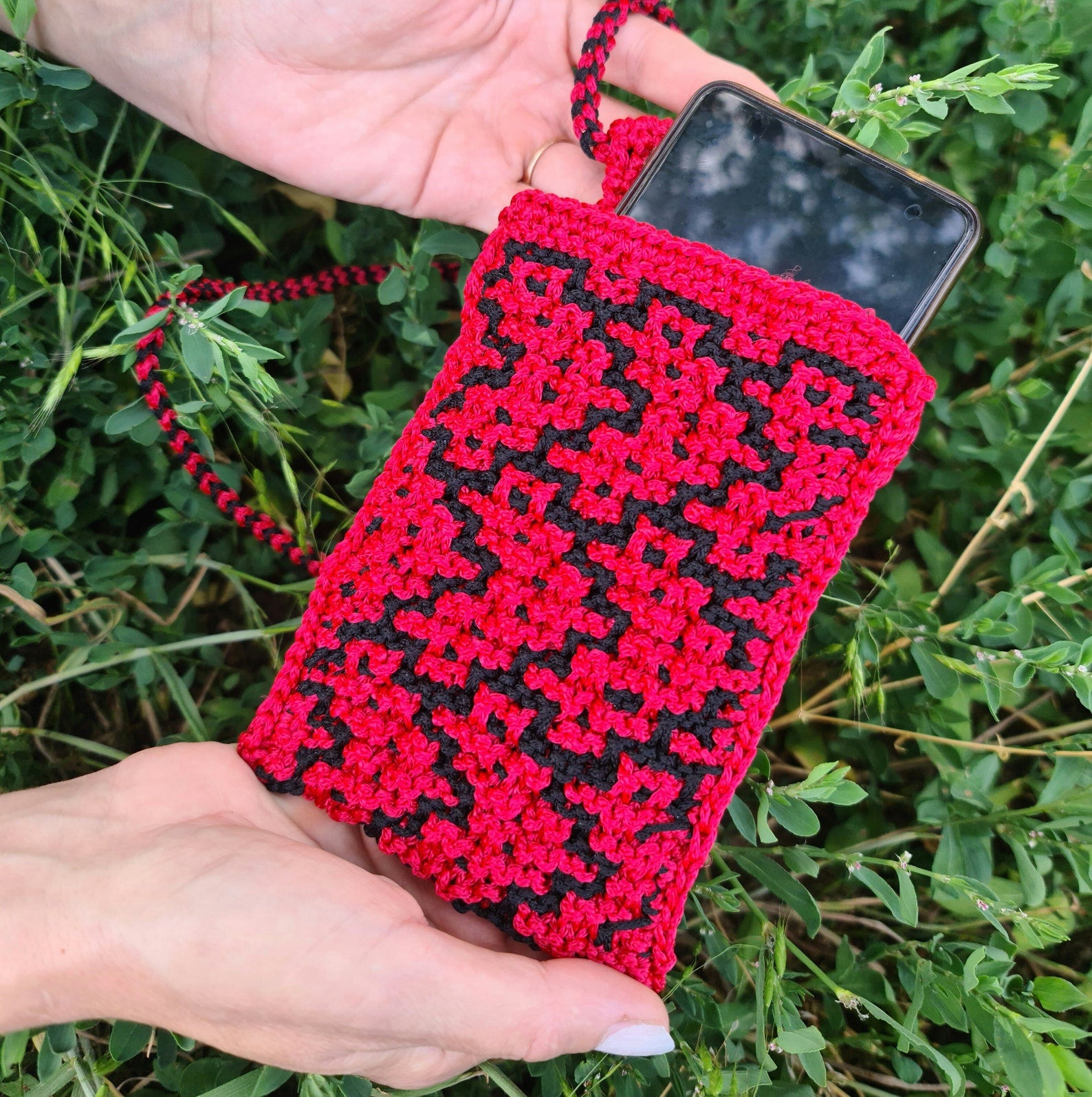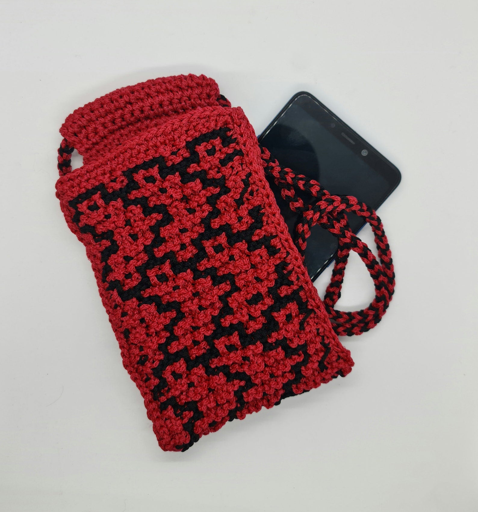 Designed specifically to fit your phone, this red and black mini-bag with pixel hearts is perfect for keeping your device close at hand while also protecting it from scratches, drops, and other potential hazards.