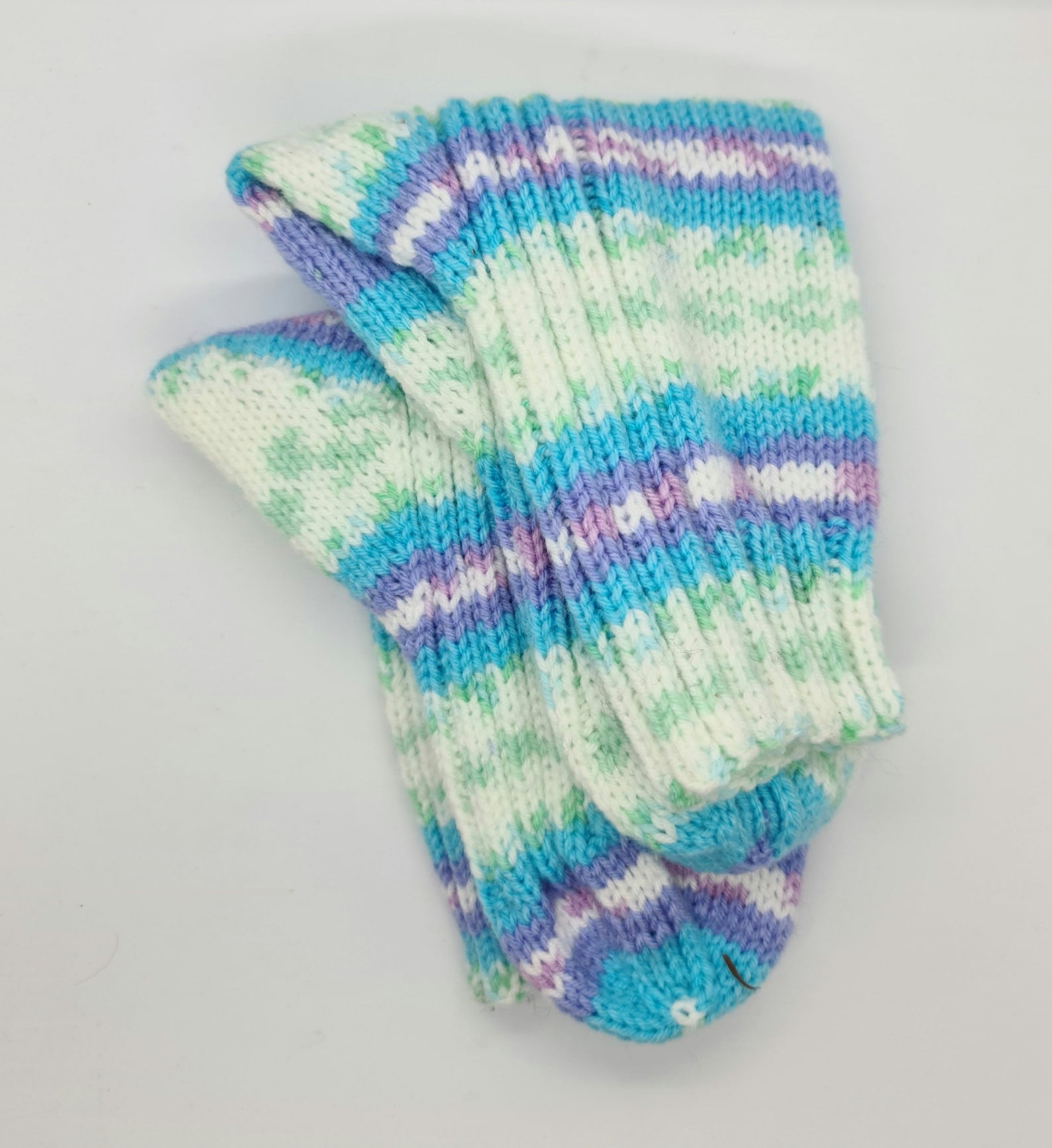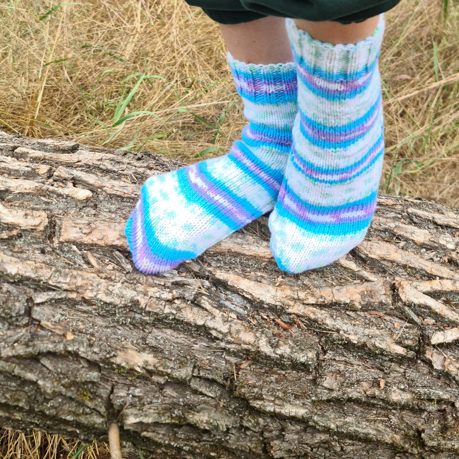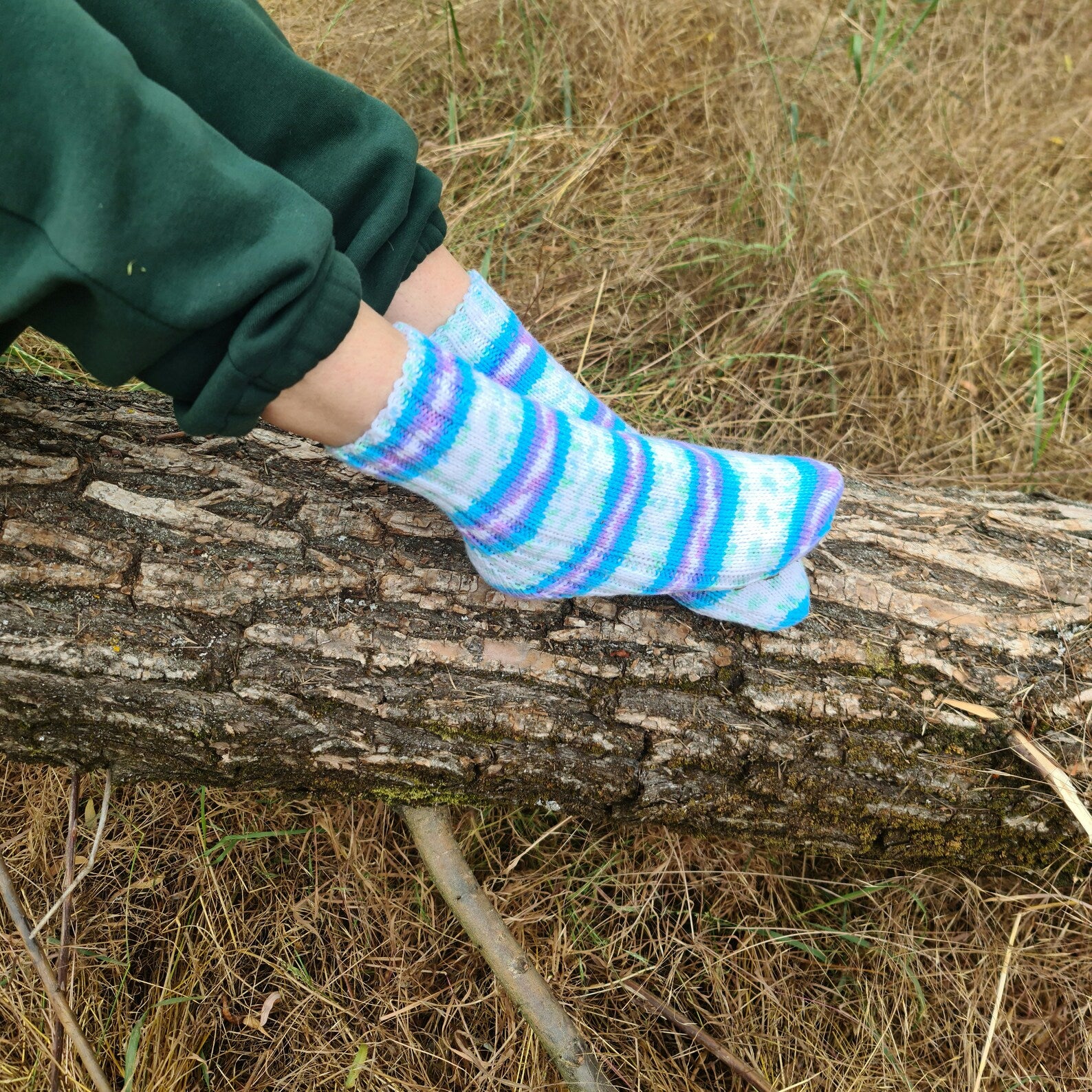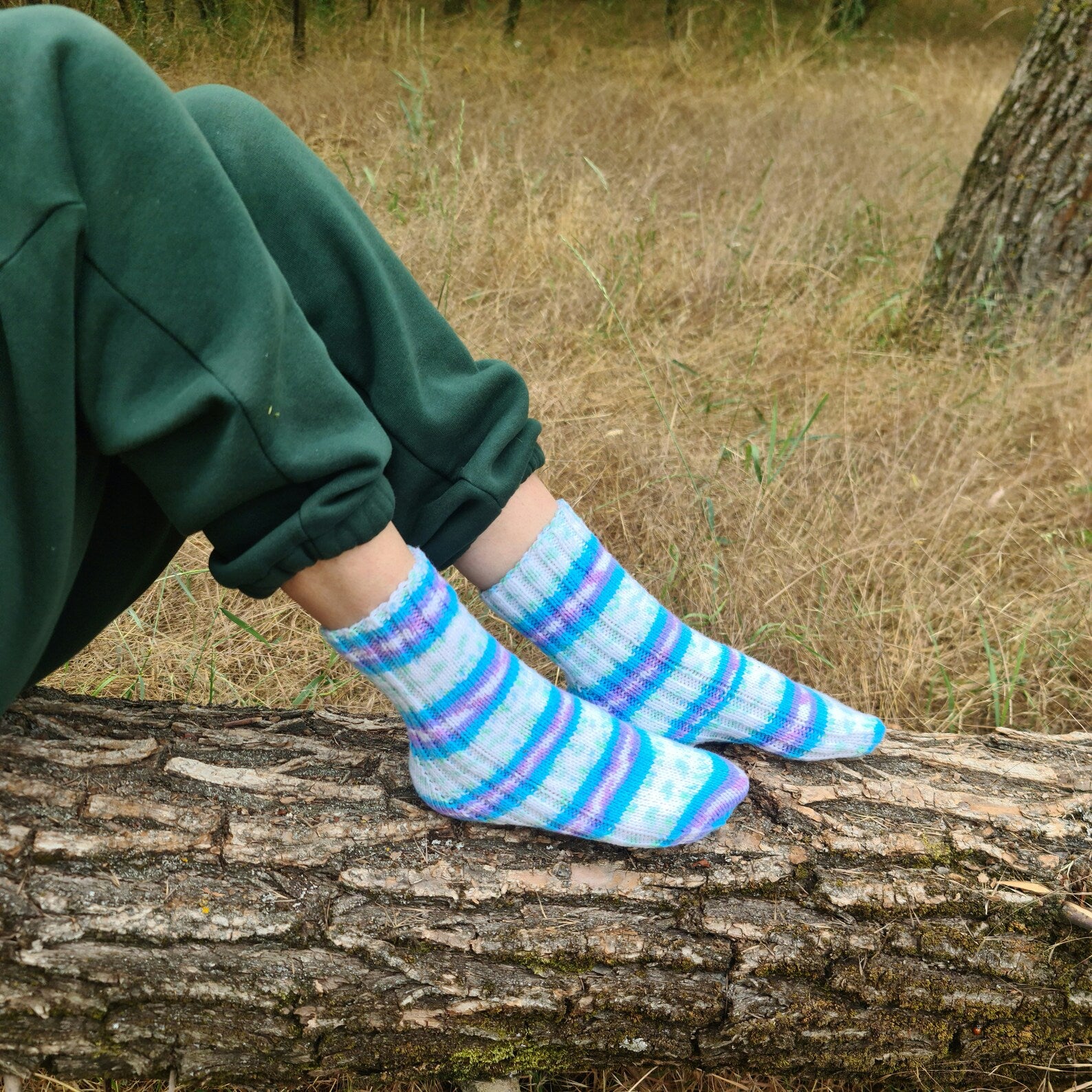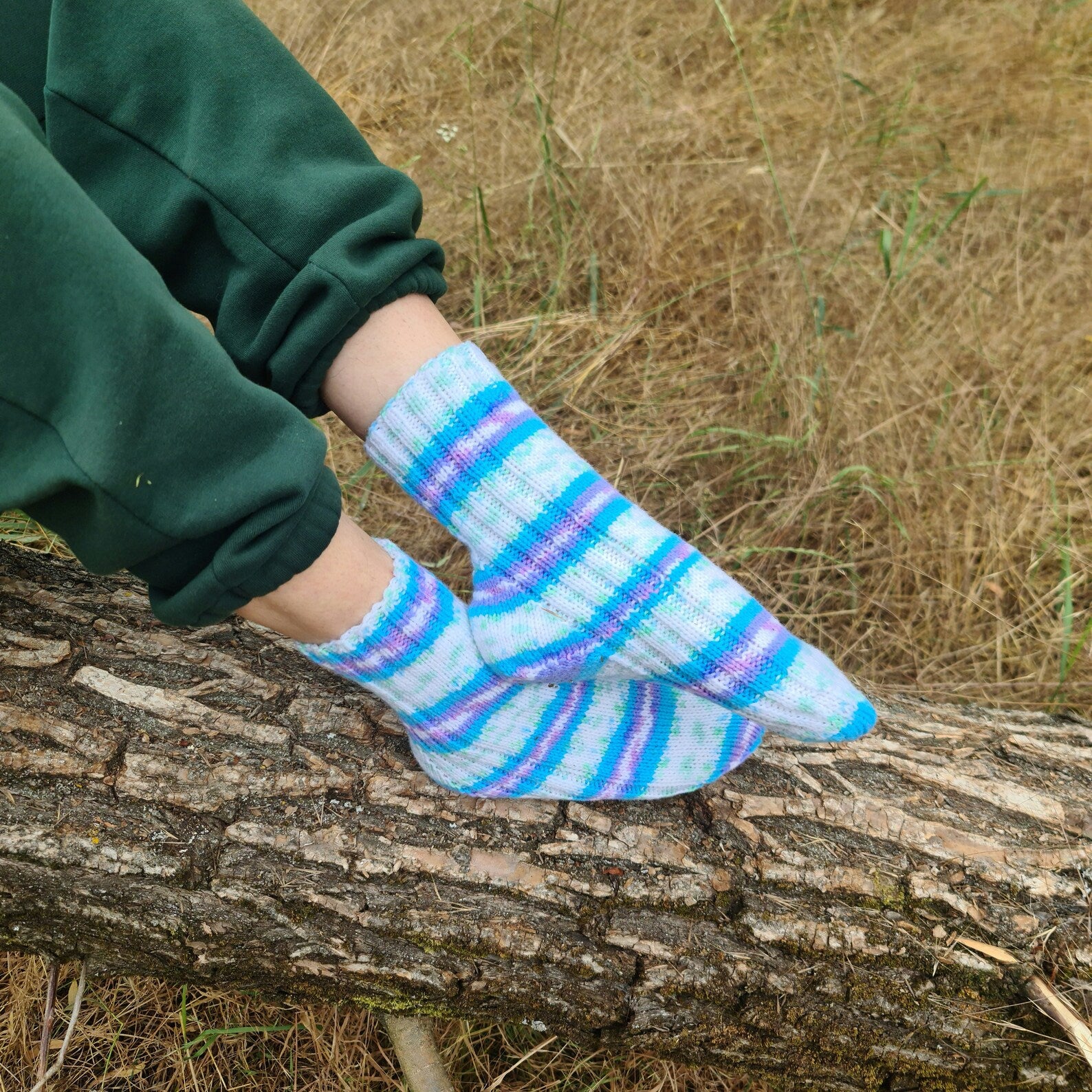 These multicolor vegan socks are hand-knitted from high-quality acrylic yarn suitable for sensitive skin. These funny socks are light, comfy, and extra warm. Such a super soft pair of socks will keep feet comfortable throughout use. Socks work great inside any tall outdoor boots. They can serve as good sleeping socks due to the fact that they strike a balance between being tight and loose.