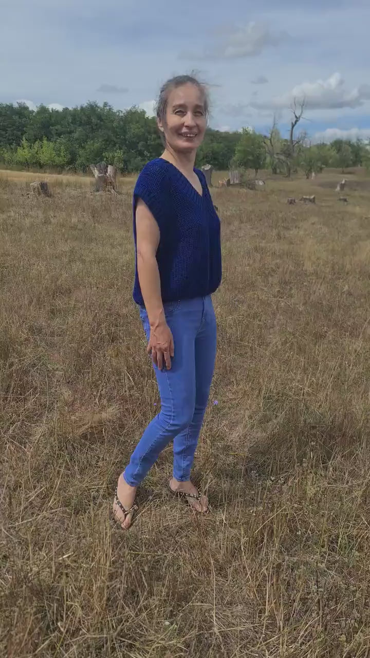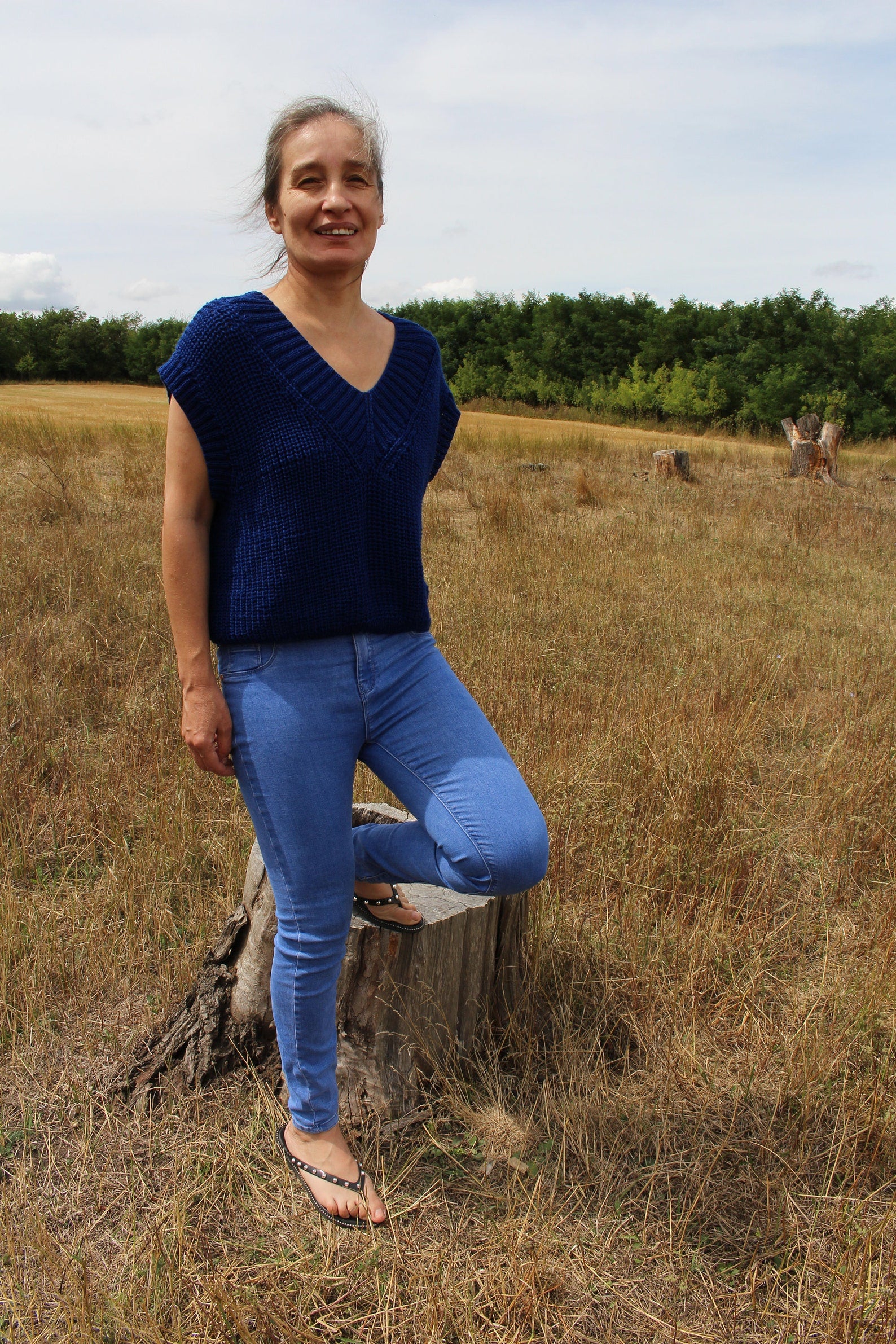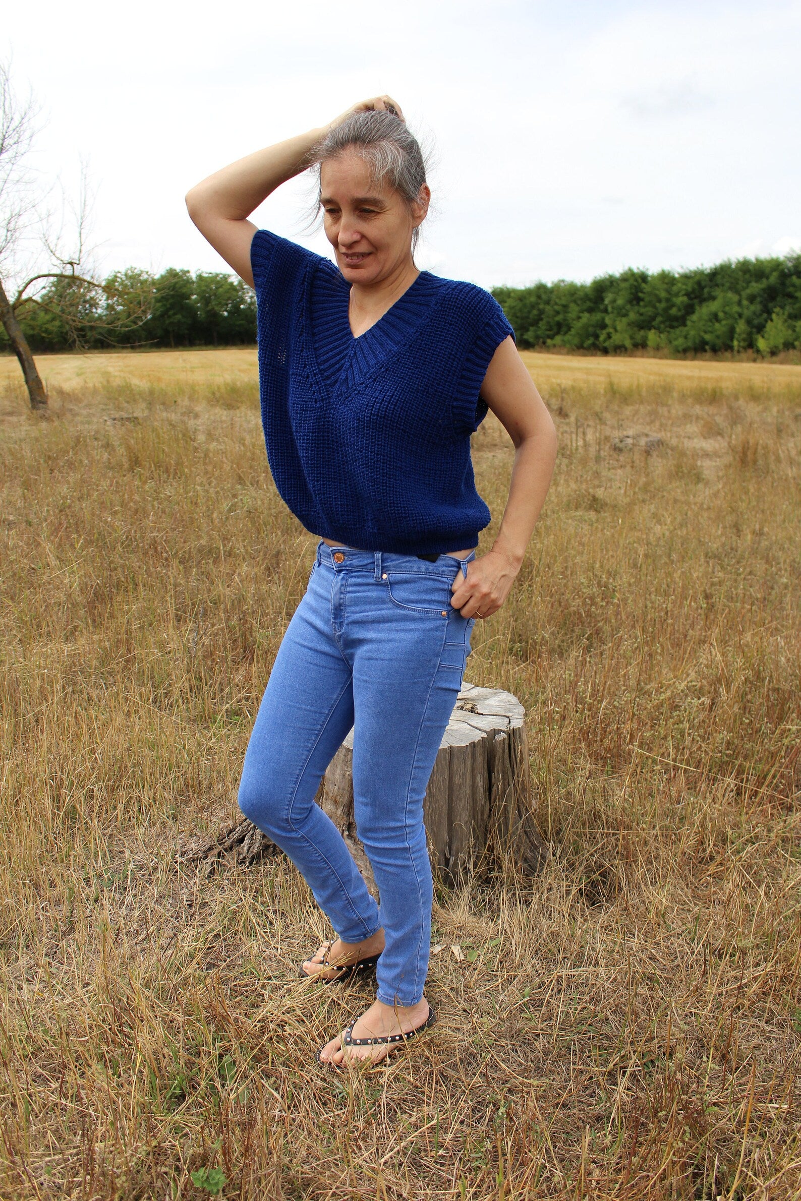 Oversized V-neck sweater vest in blue, Stylish sleeveless jumper for women