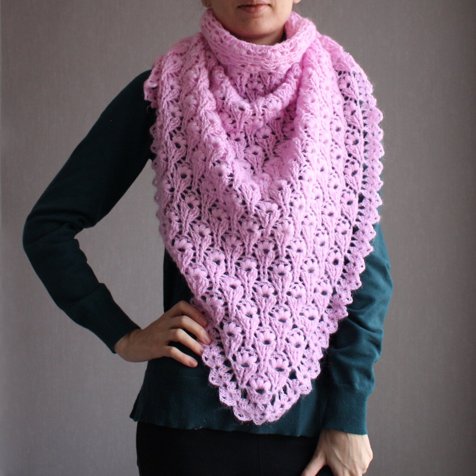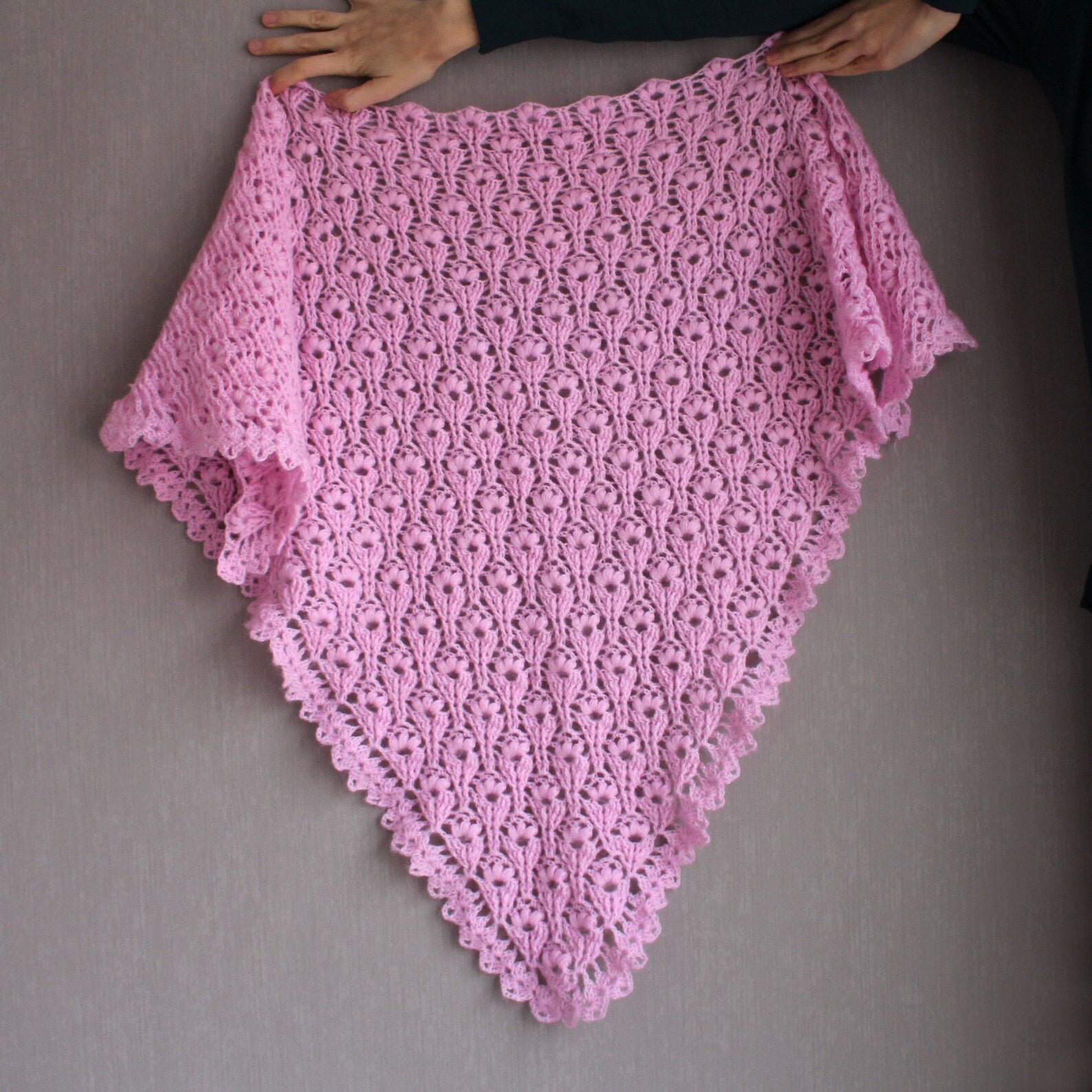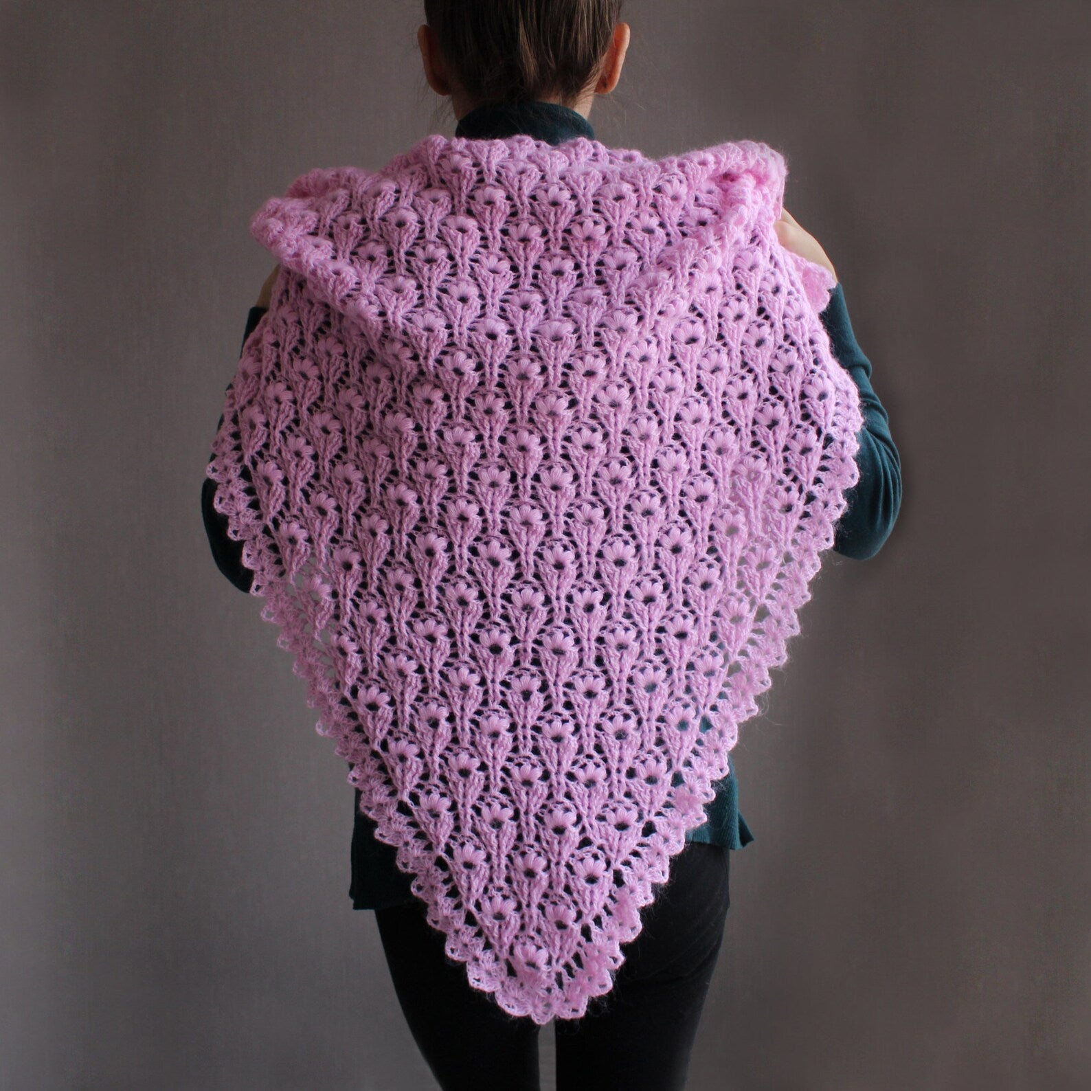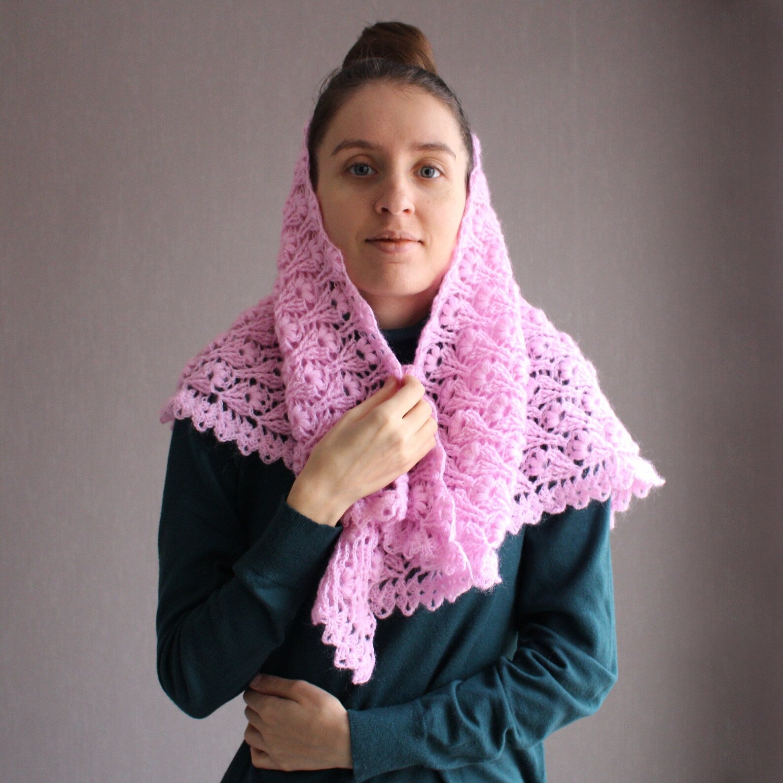 Pink crochet shawl, Warm triangle wrap, Delicate sheer headscarf