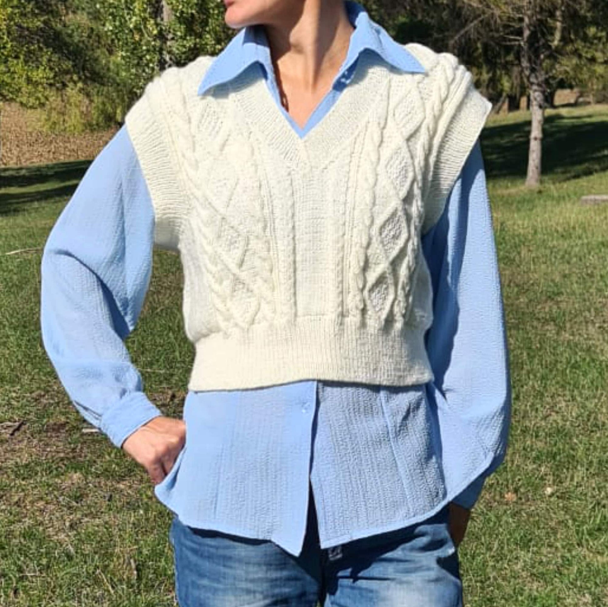Knitted from the finest wool and acrylic blend, such a solid-colored chunky sweater vest is perfect to match with your favorite skirt. A cropped textured vest may be worn in a variety of ways. For a retro street-style getup, combine your oversized vest with a pair of baggy jeans. Alternatively, pair an oversized sweater vest with leggings for a more casual outfit. It will look great under a cardigan for a knitwear-forward look or layered over a shirt dress to add additional shape. A warm sweater vest over a white T-shirt is a classic ’90s look, and ’90s fashion trends have made a comeback in recent years.
