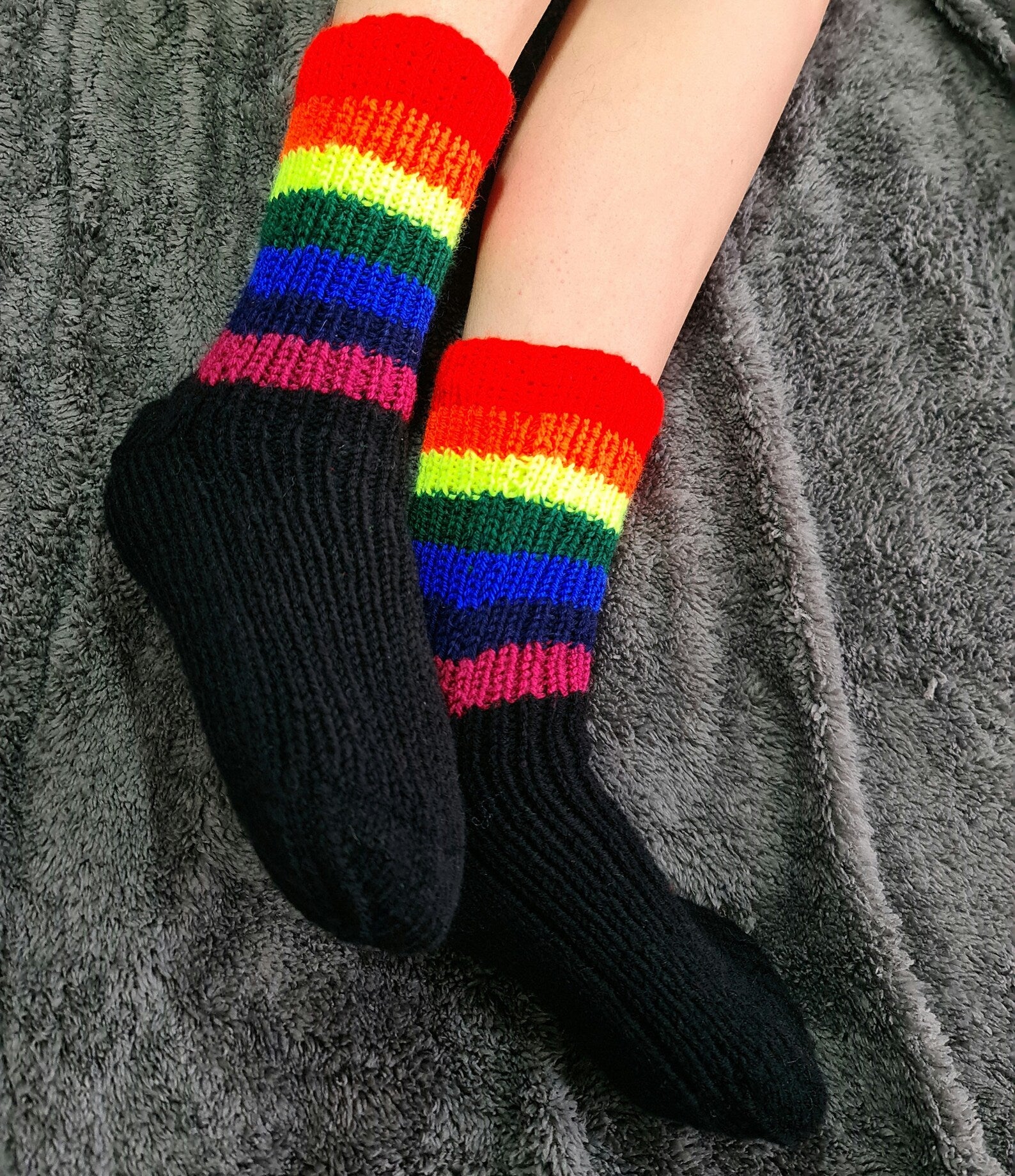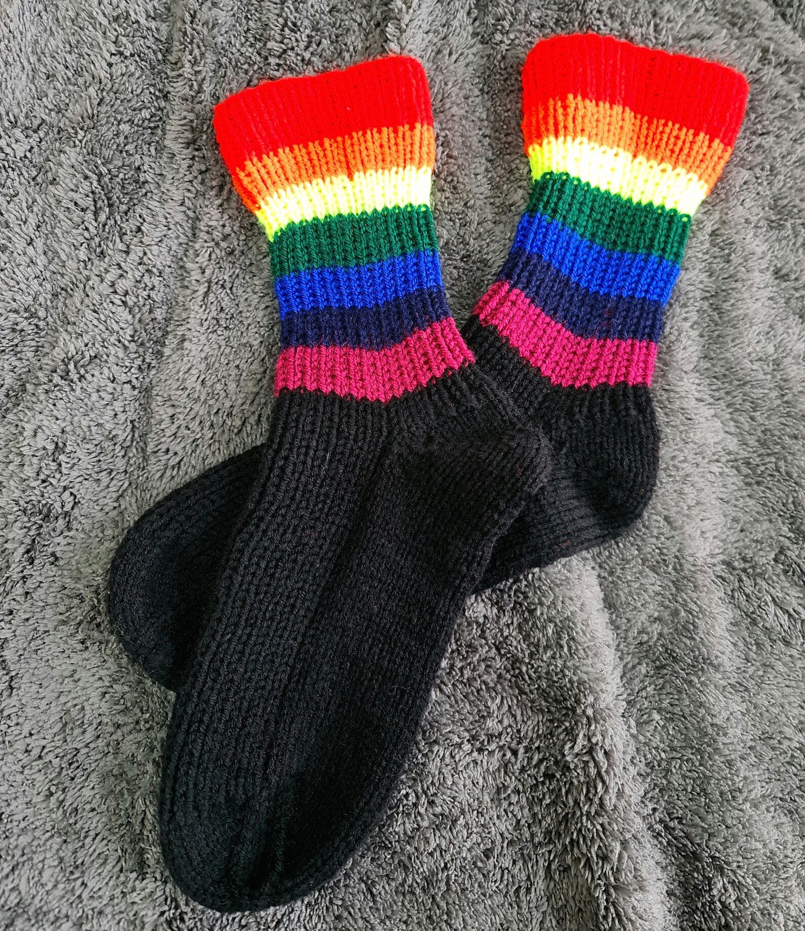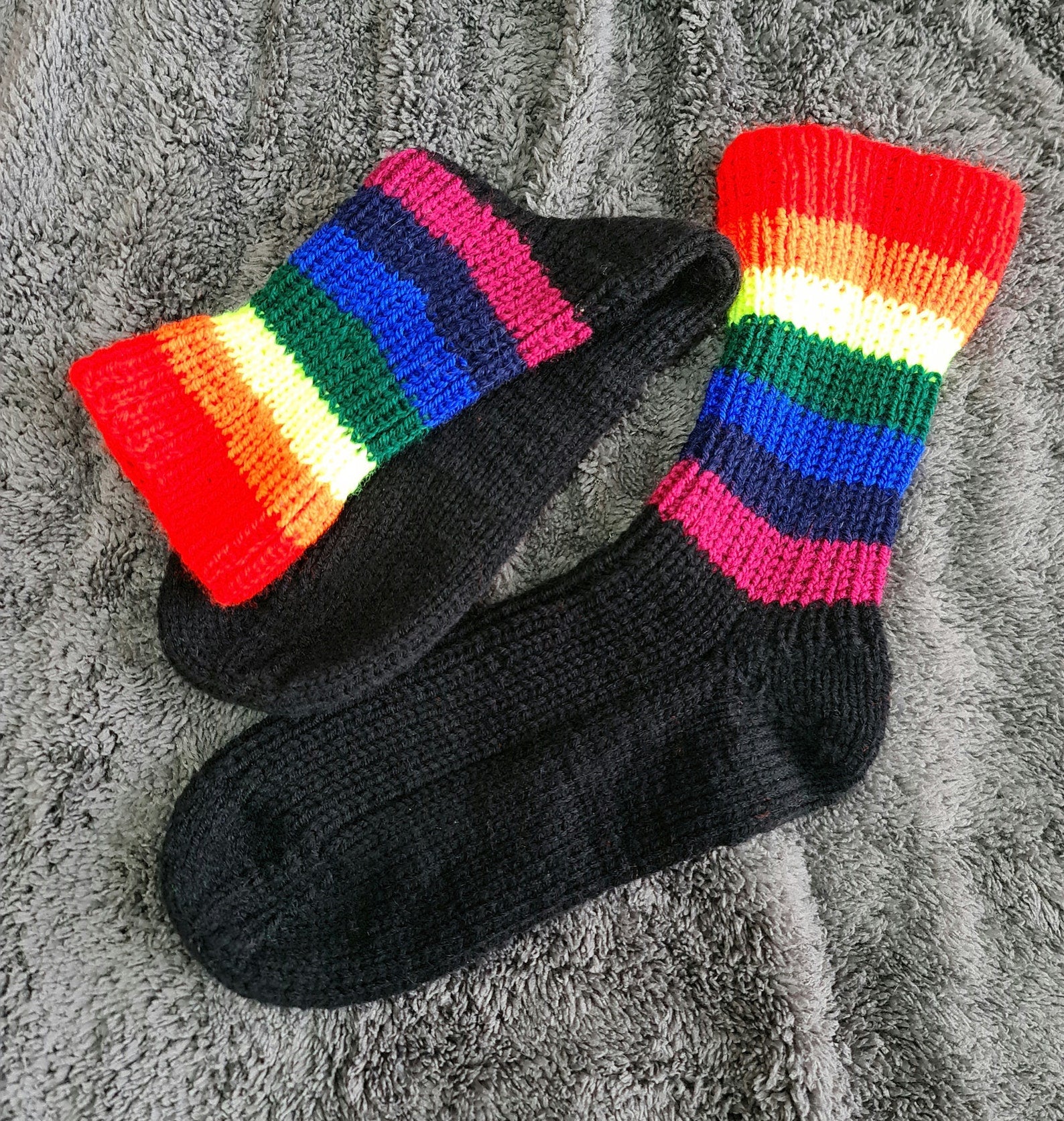 These rainbow crew socks will put a smile on your face and those around you as you walk down the street. Colorful striped socks will help brighten up any outfit and make it stand out from the rest. Such ribbed socks will also keep your feet nice and warm! Socks are made with durable and soft yarn, so they're sure to last you through many adventures.