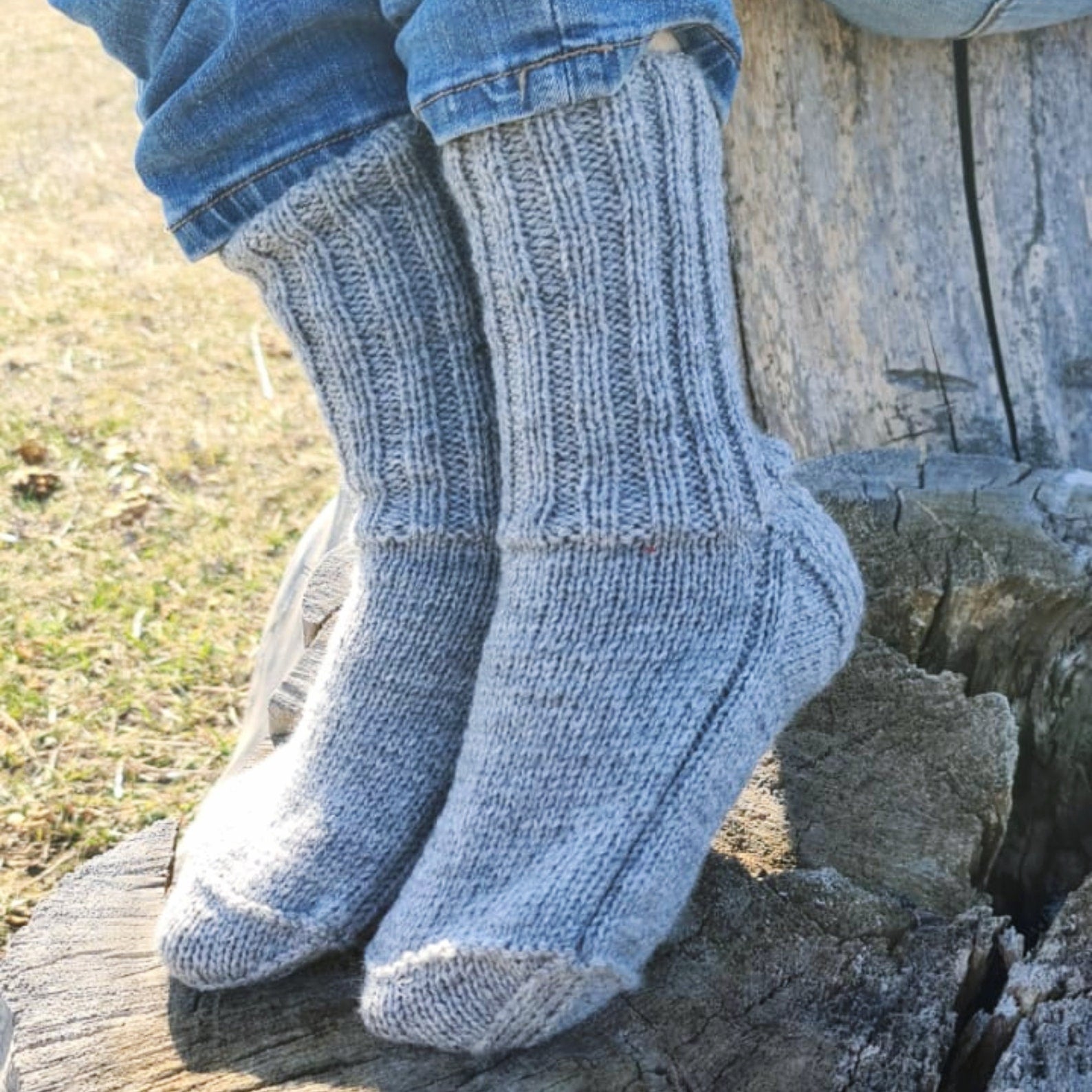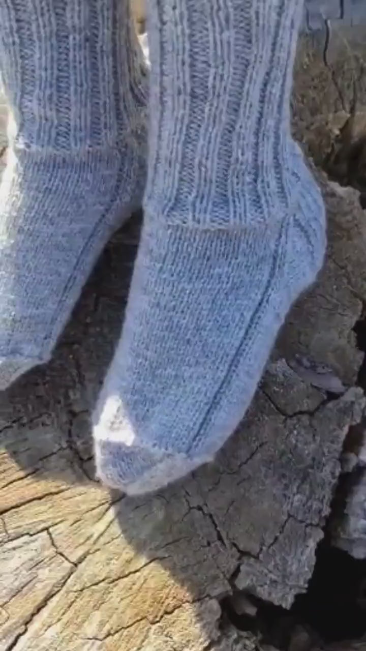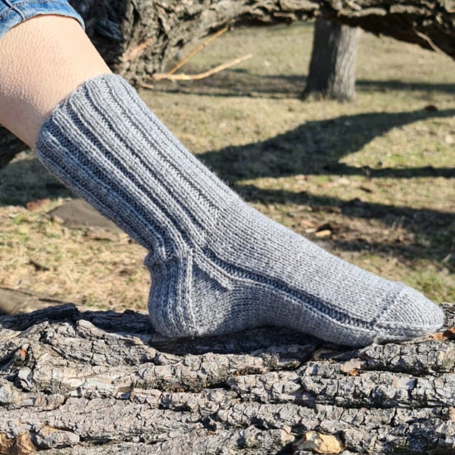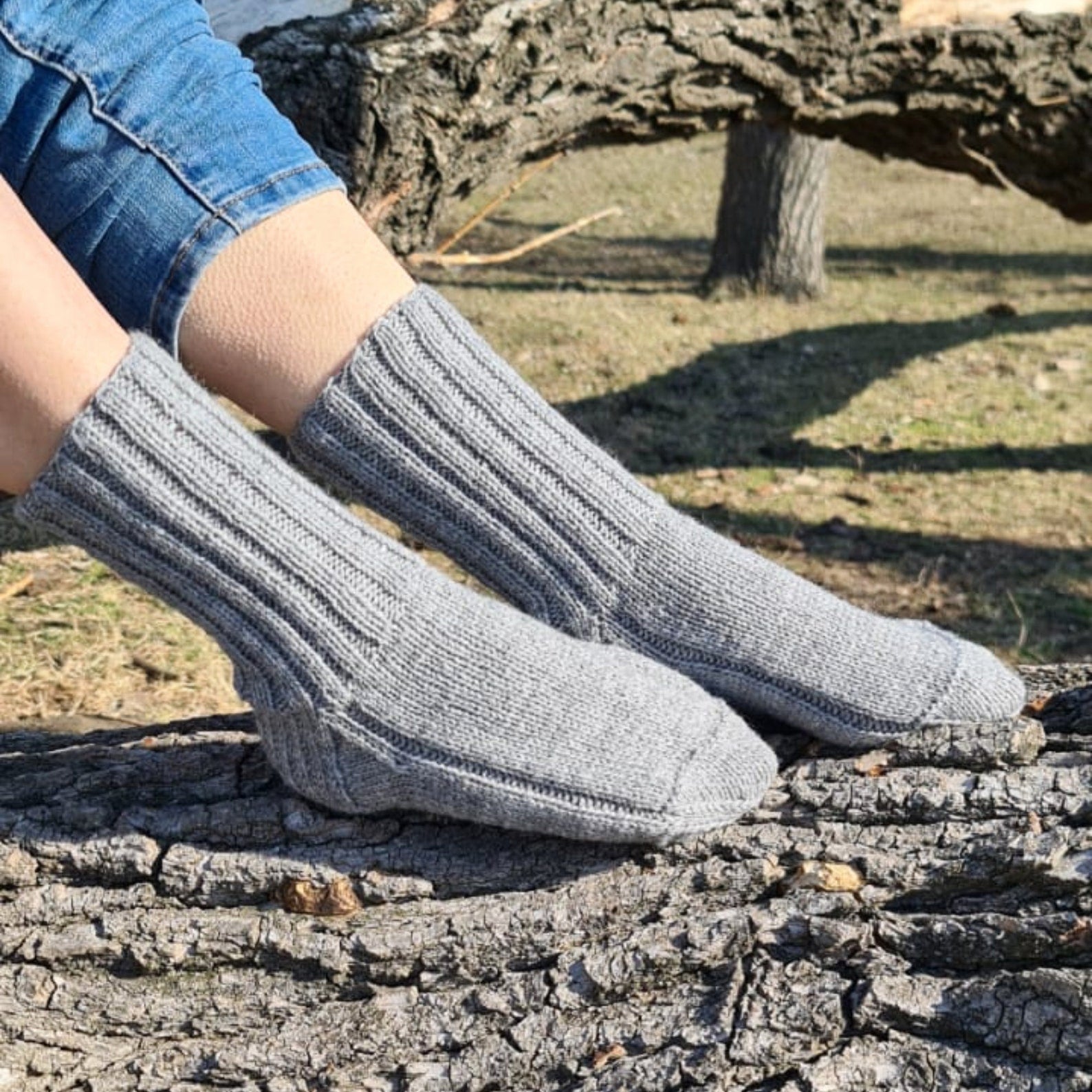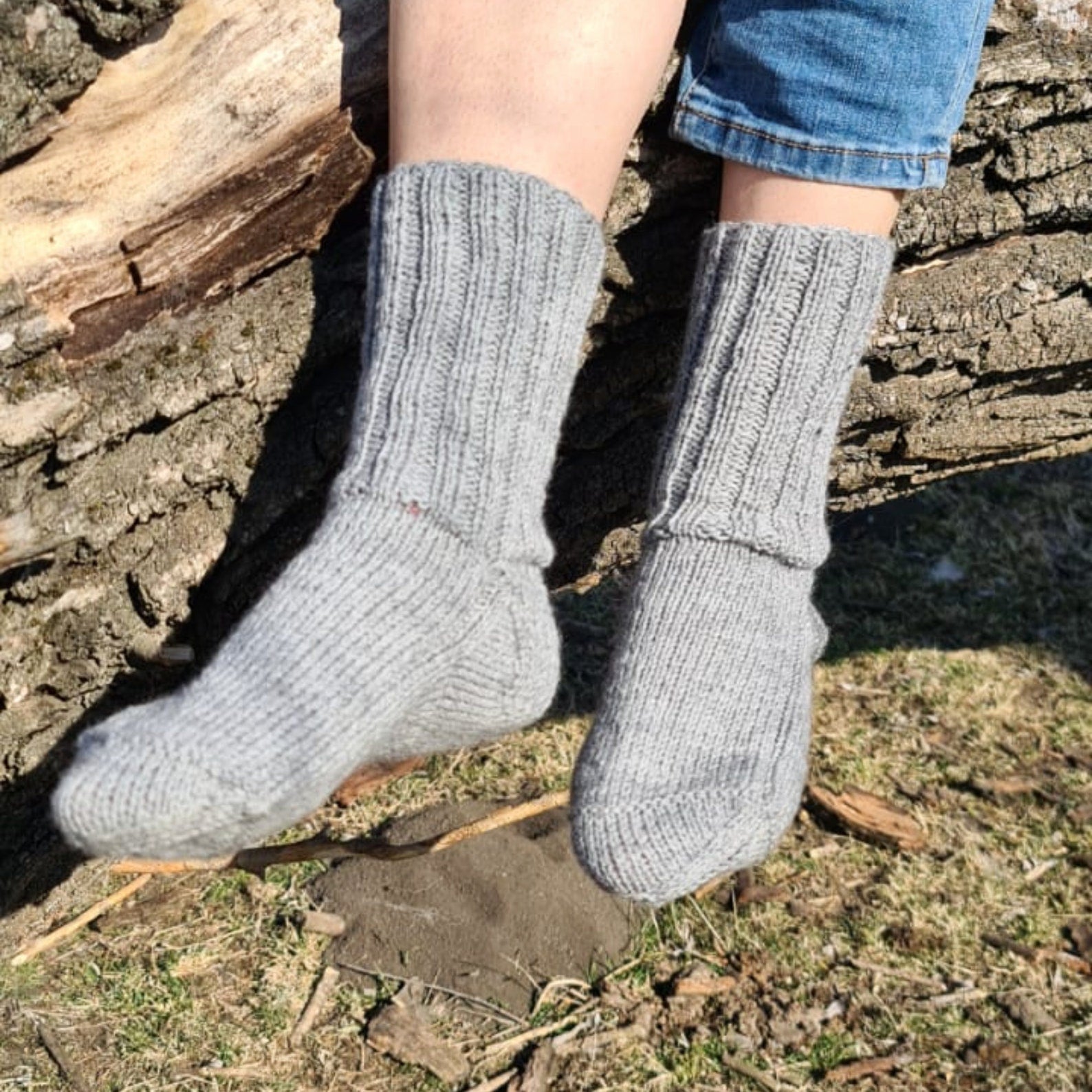 These lovely crew socks will help you keep your feet warm while being in style. Socks can be the perfect gift for a husband, or wife. They work great inside any tall outdoor boots. If warm-and-cozy hygge vibes are your thing then these hand-knitted gray socks are for you!