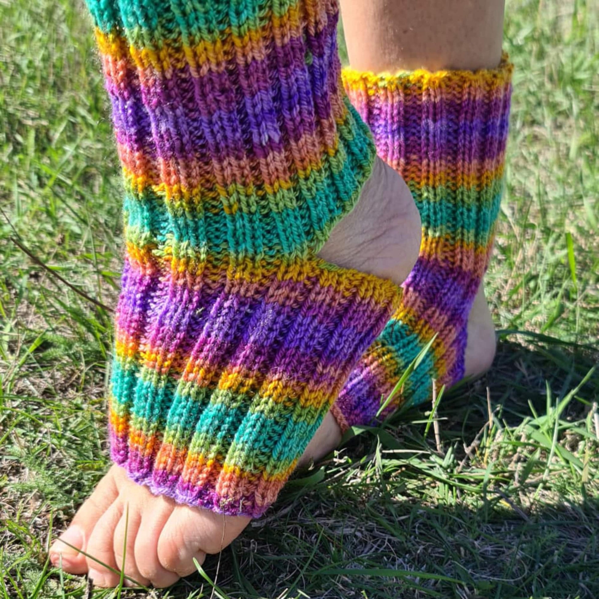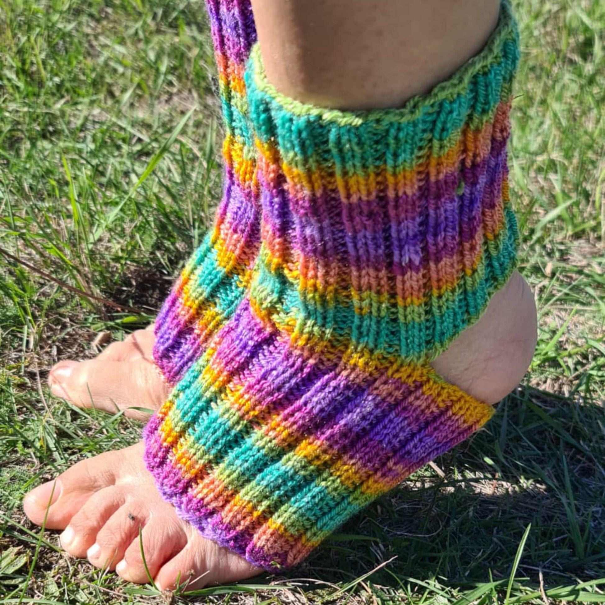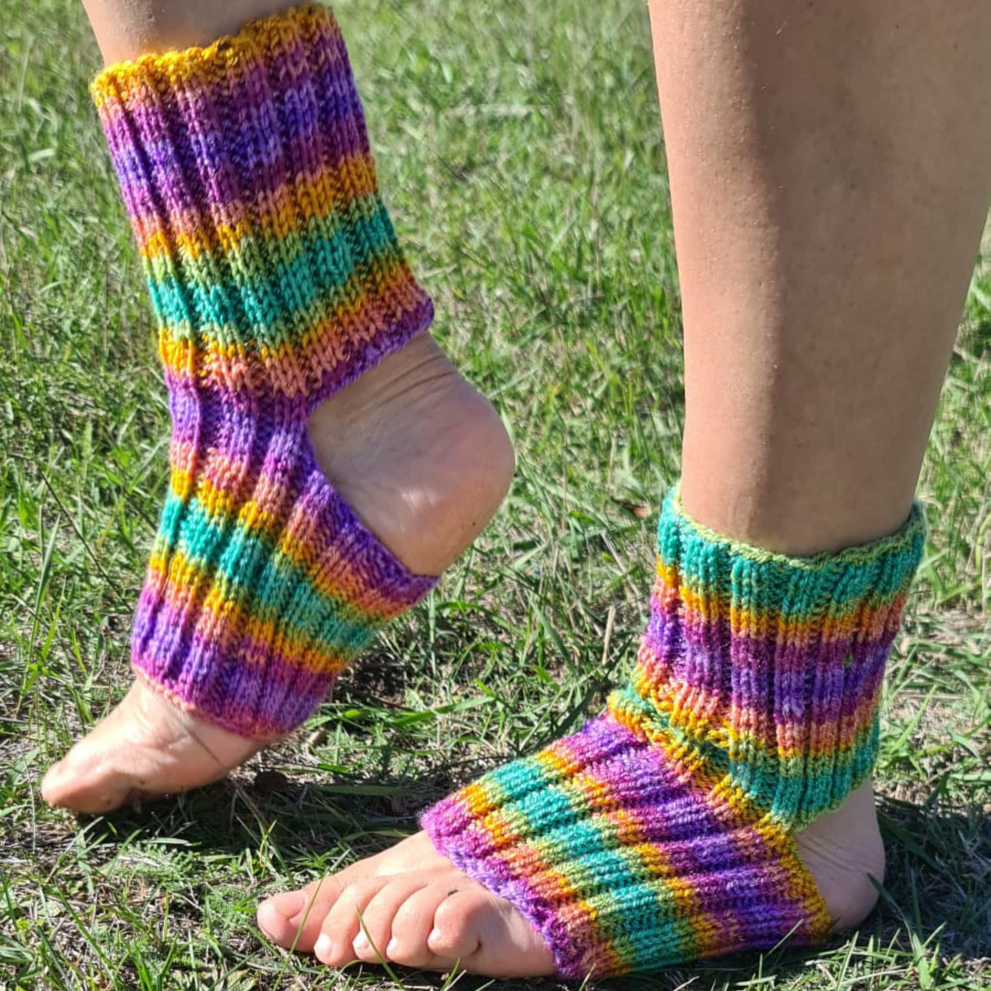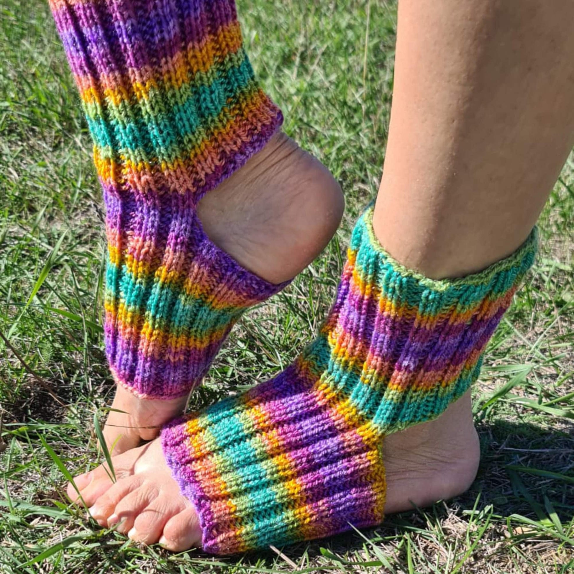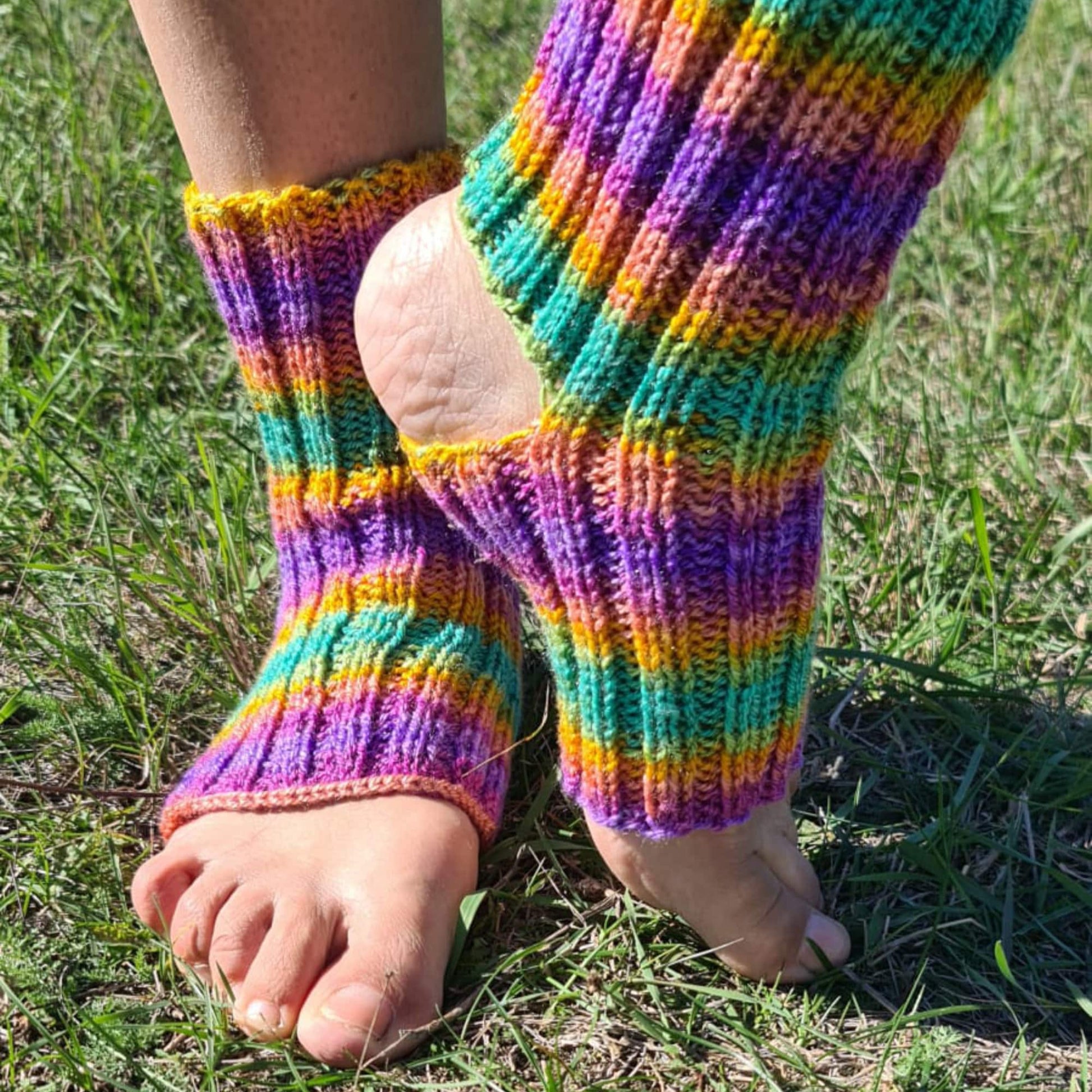 These hand-knit colorful breathable socks are perfect for any activity that requires bare feet. The open heel and toe provide extra grip during yoga postures, dance moves, pilates, and barre.